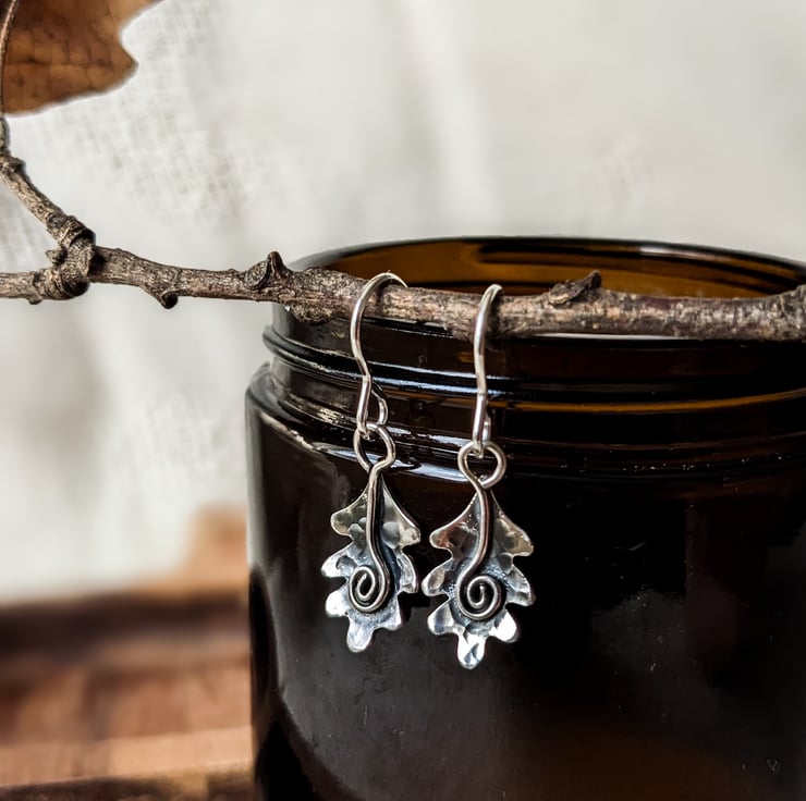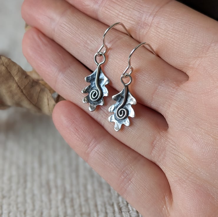 A pair of hammered sterling silver Oak Leaf drop earrings, made entirely by hand in my workshop in West Yorkshire.