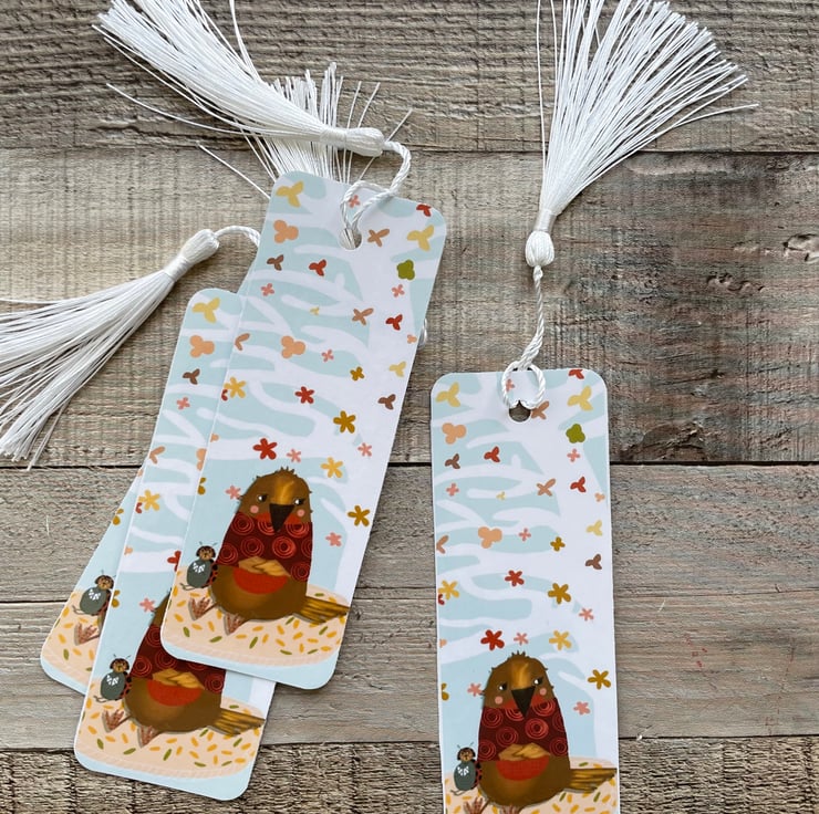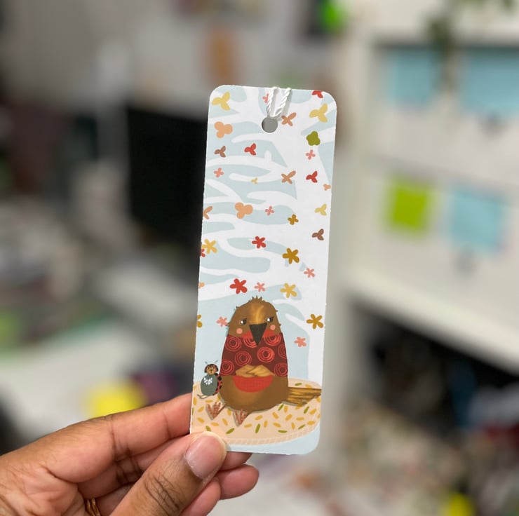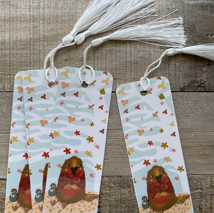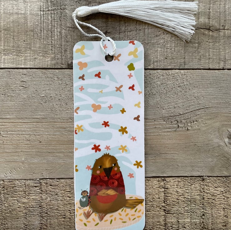 New autumnal art bookmark, meet Coco the Ladybird and Bailey the Robin. Autumn is in the air as they watch the leaves fall dreamily from the large tree above them. Coco is reading a story to Bailey.