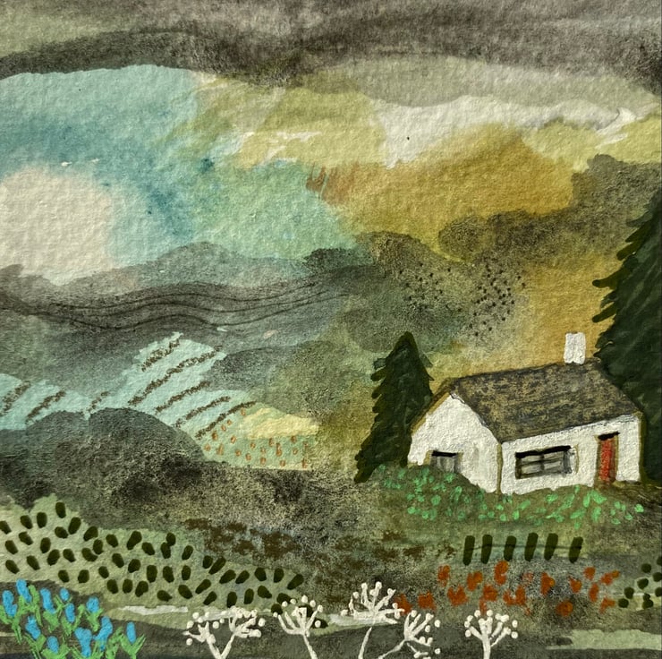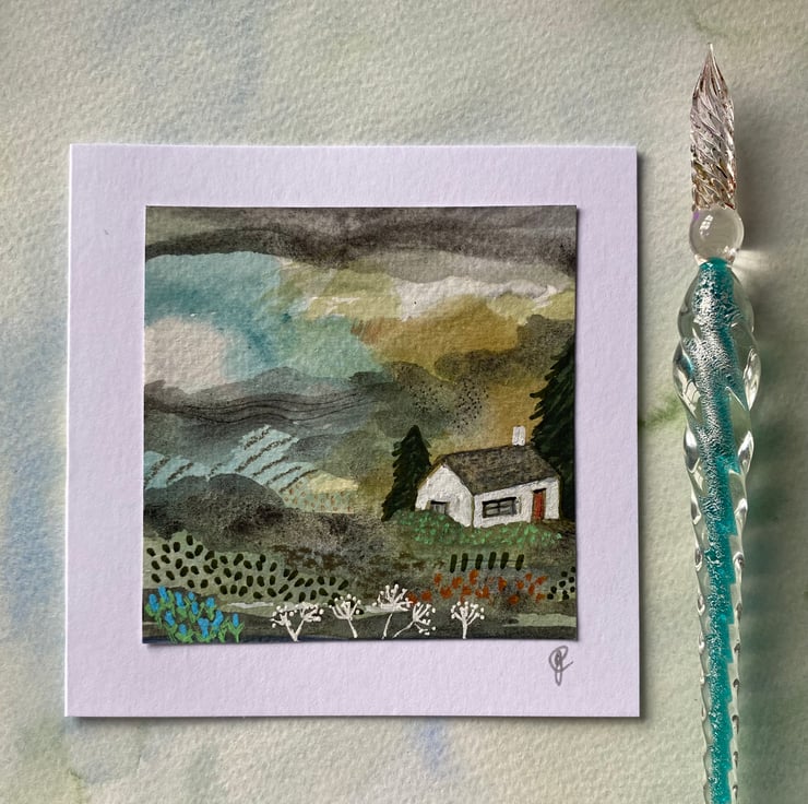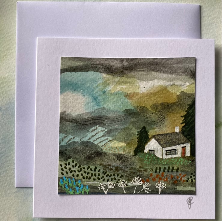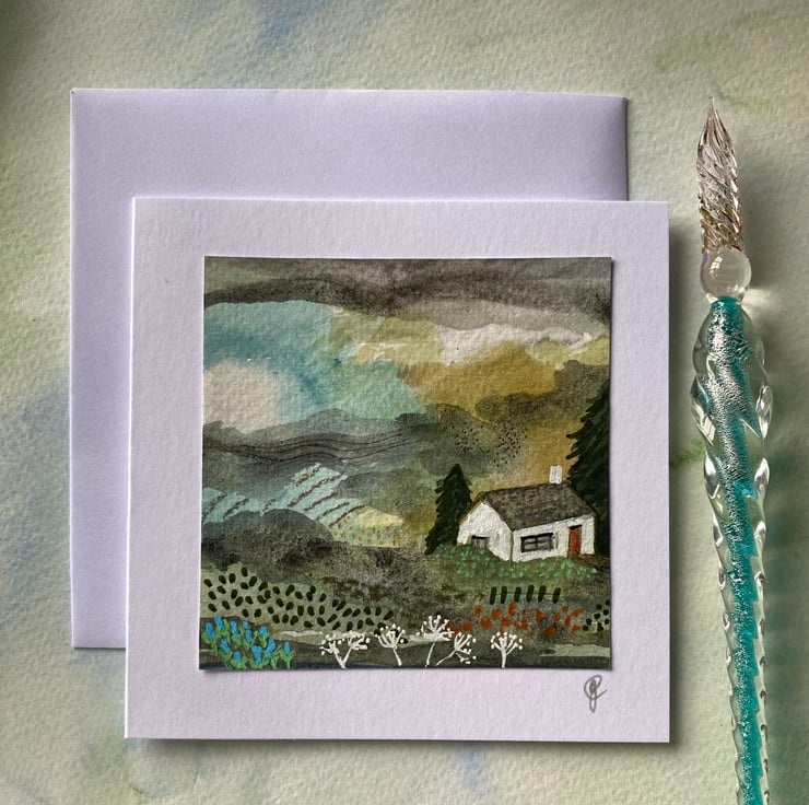 This is a scene painted in watercolour and ink on 7.5cm sq. watercolour paper and mounted onto white card stock measuring approx 10cm (4”) sq. It is blank inside for your own message. It comes with matching envelope and is packaged in a cello bag. Postage is free to UK destinations.
