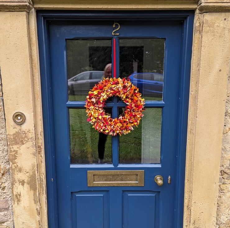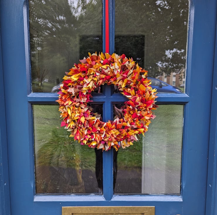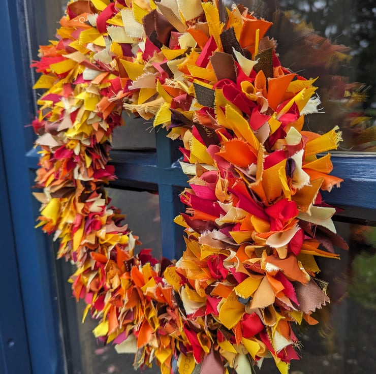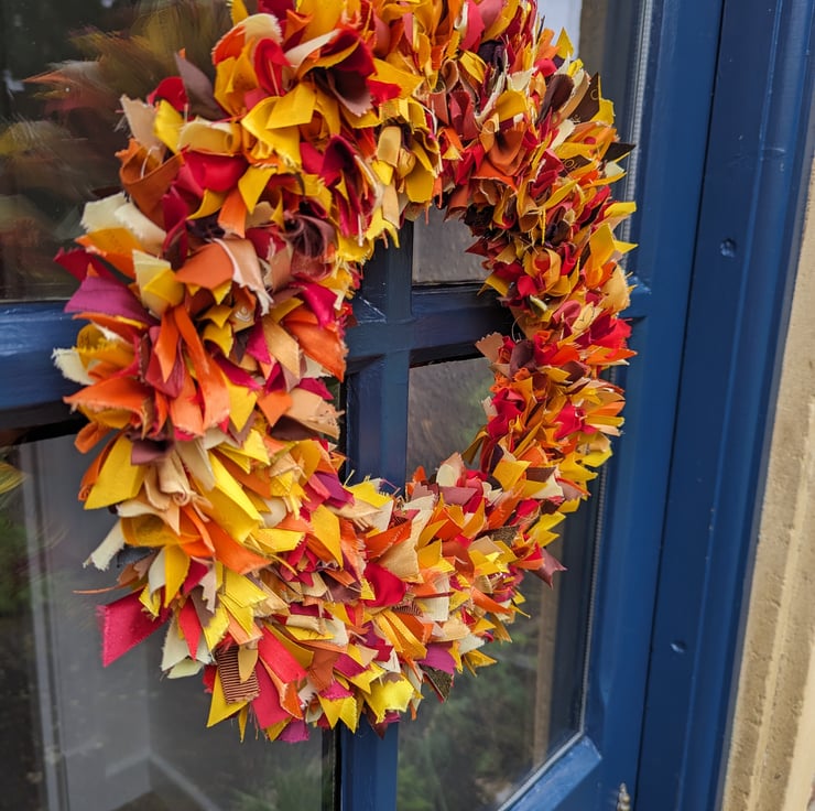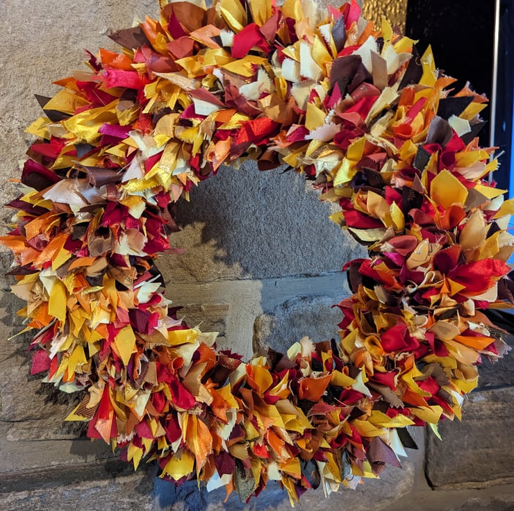 Eco friendly upcycled wreath. Handmade here in the UK in the village of Gainford,with ribbons and materials destined for landfill.