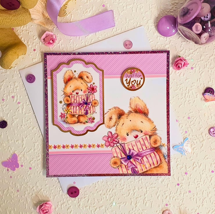 A cute card, in soft colours, suitable for birthdays or other celebrations, even as a "Just Because" card. It features a cute little bunny delivering a gift and a flower, perfect to accompany your presents to a friend, relative, neighbour, colleague and so on!
