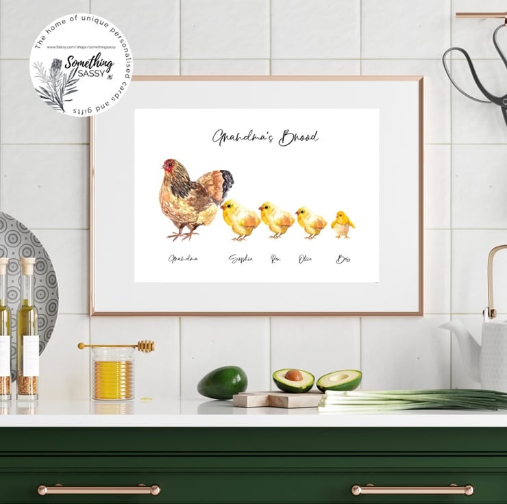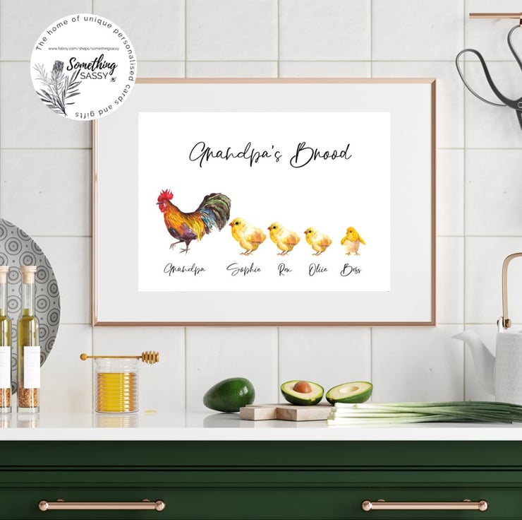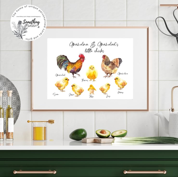 This personalised art print features a family of Chickens, which can be customised with any names of your friends or family to make the perfect gift!