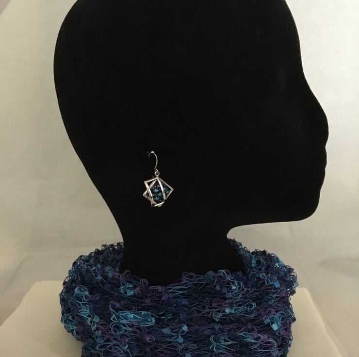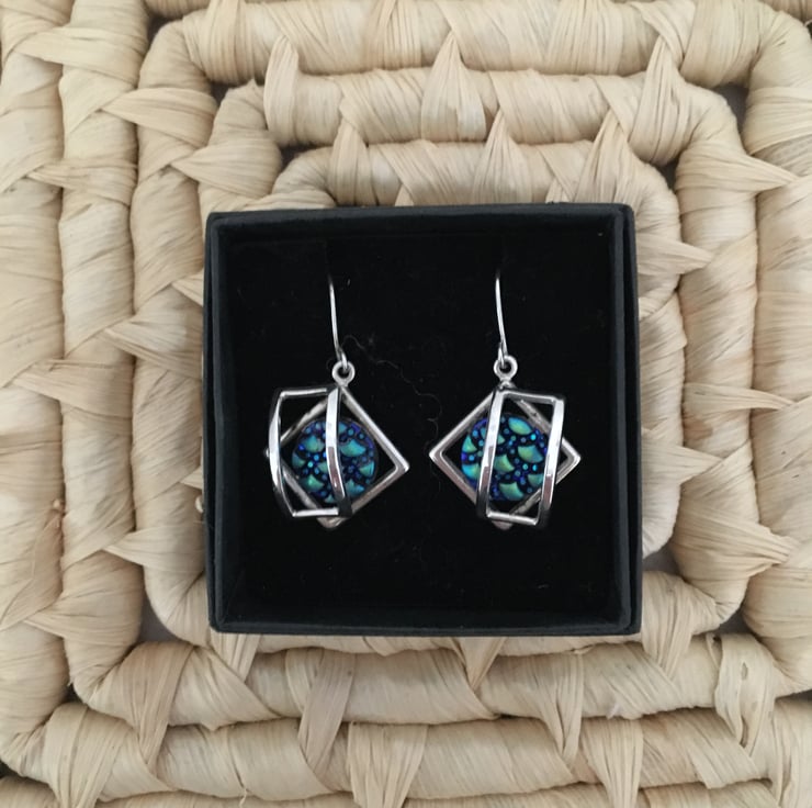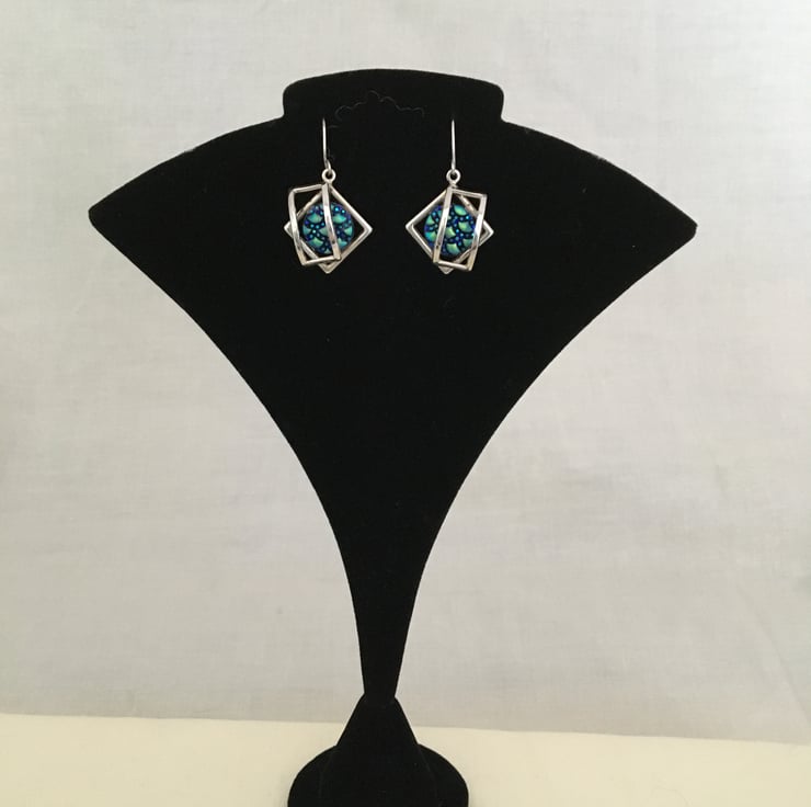 They measure 1 in x 1 in and have a drop of 1.5 in from silver plate earwires.