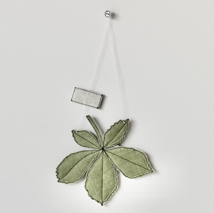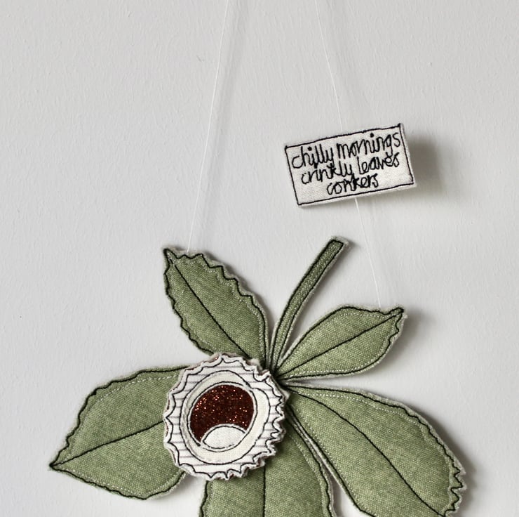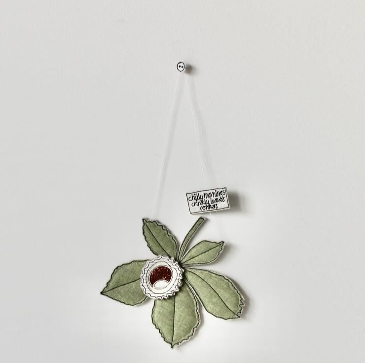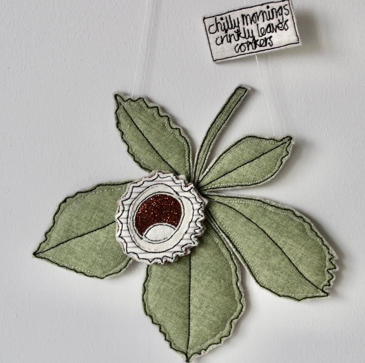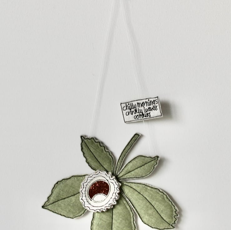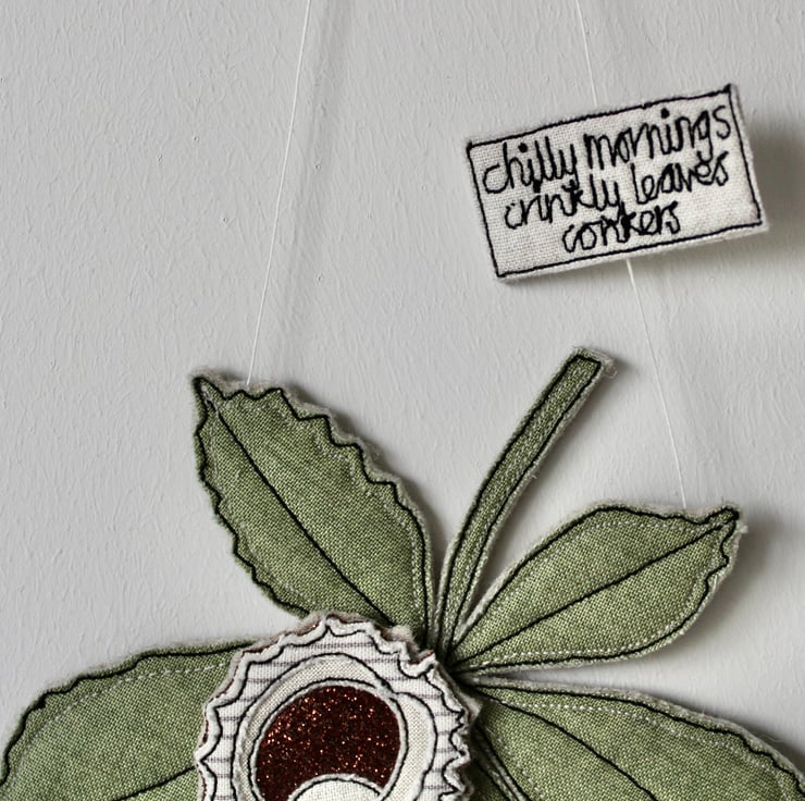 Each of the leaves and conkers are sewn using a combination of 100% wool felt, cotton cloth, glitter cloth and free hand machine embroidery; multiple layers of cloth are sewn together and cut out by hand using very sharp scissors.