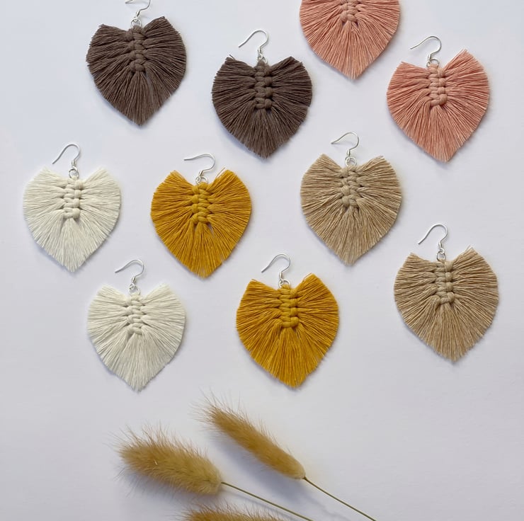 Beautiful boho style Macrame Leaf Earrings, handmade from 100% recycled natural cotton in a choice of five lovely colours.