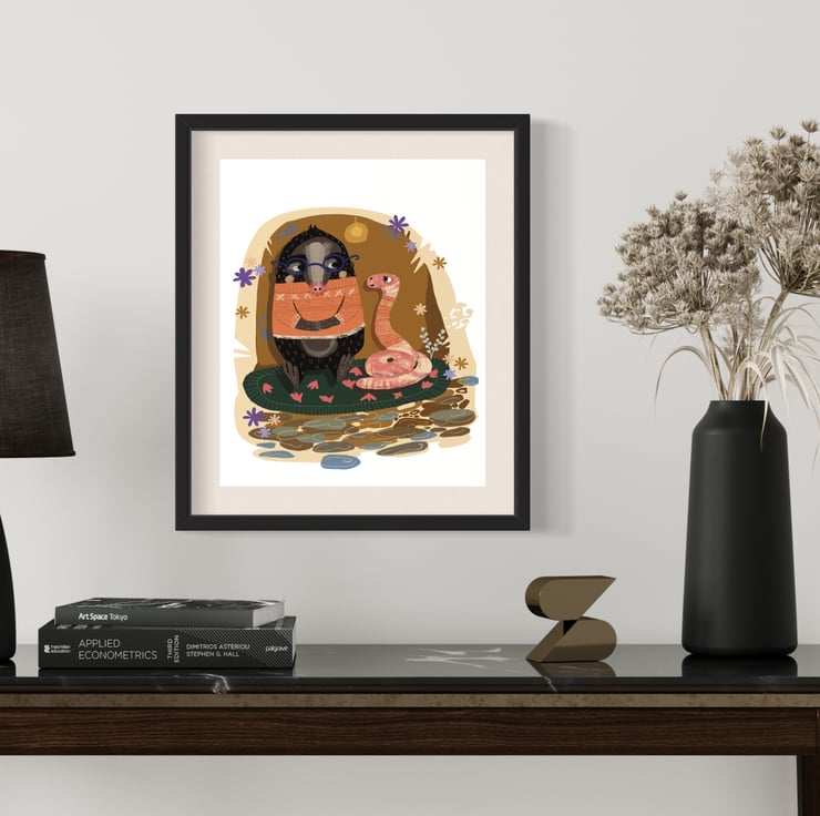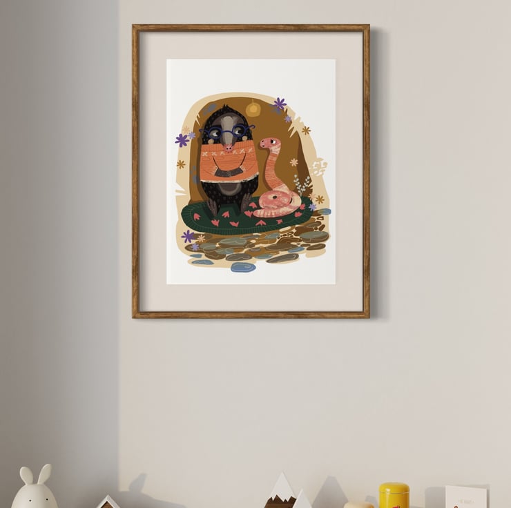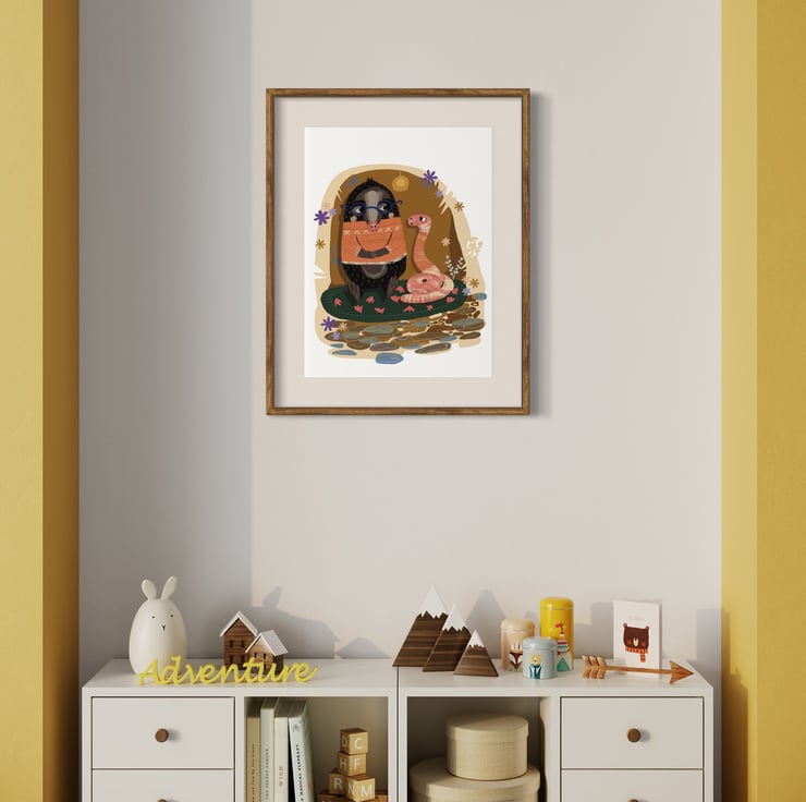 Art print depicting a William The Mole and Cecil The Worm Autumnal. Printed at home. Colour Varys slightly from screen to screen. Colour as close to original as possible.