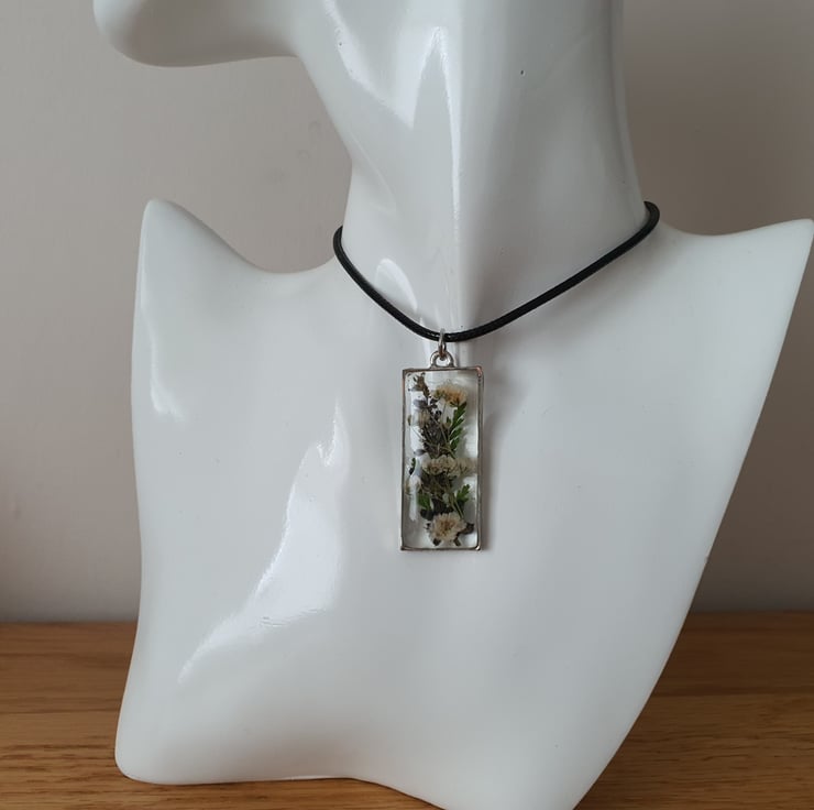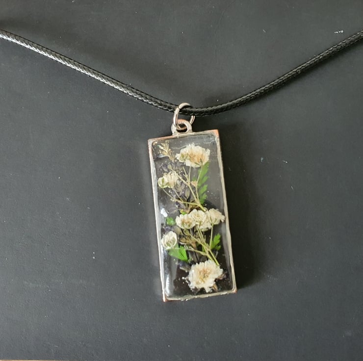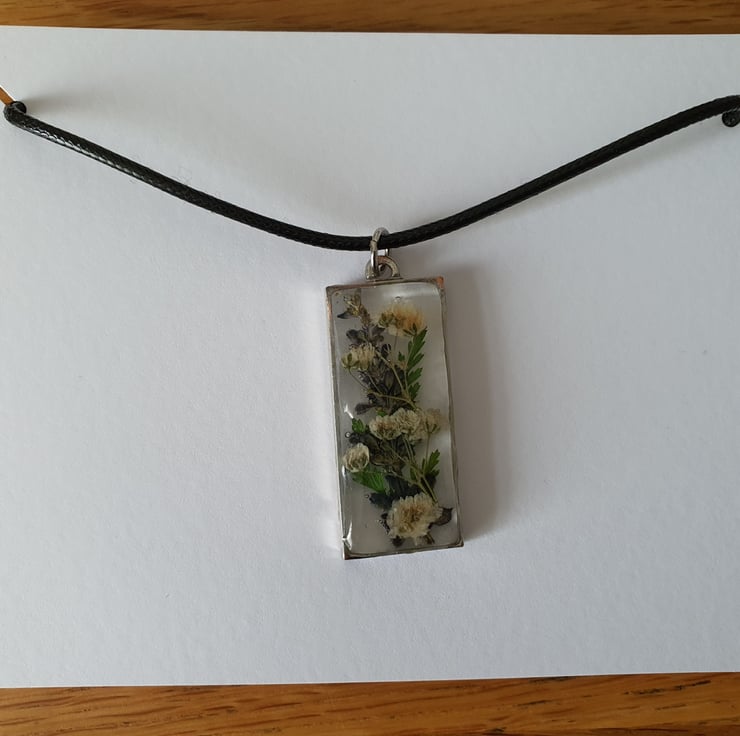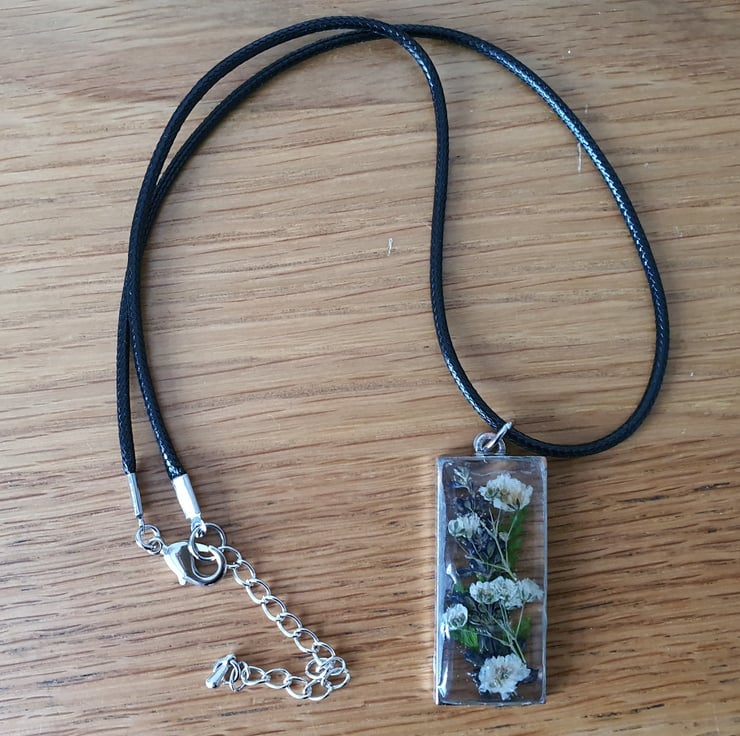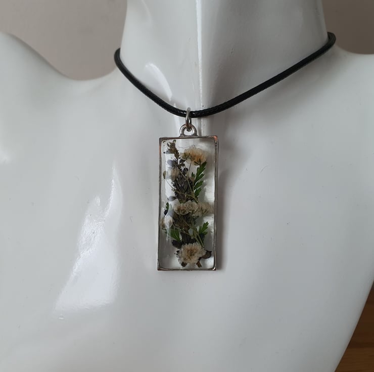 The flowers have been layered into the resin to create a dimensional effect. It is hung on an 18" cord with an extender chain.
