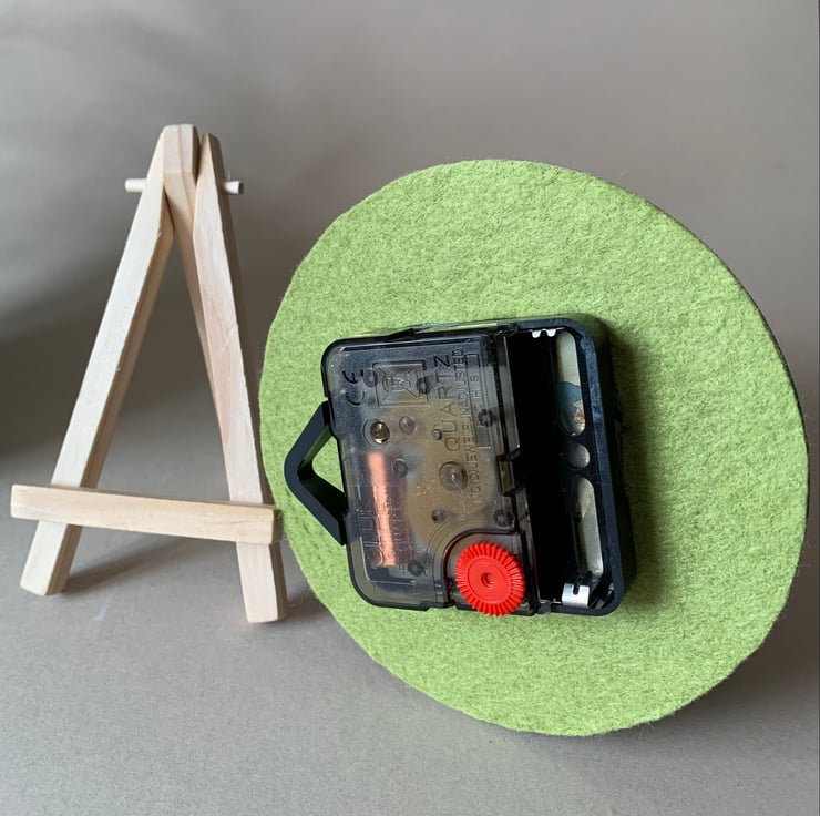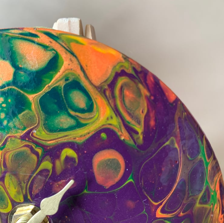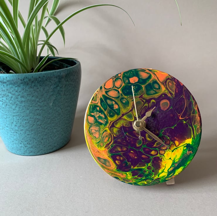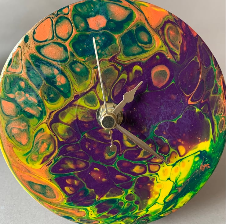 This little clock is 4.75”/12 cm in diameter. It is upcycled from a CD, painted with acrylics using the fluid art method and varnished for protection. The back is felted to give it a clean finish. It is fitted with a quartz mechanism ( silent sweep) and has gold coloured hands.