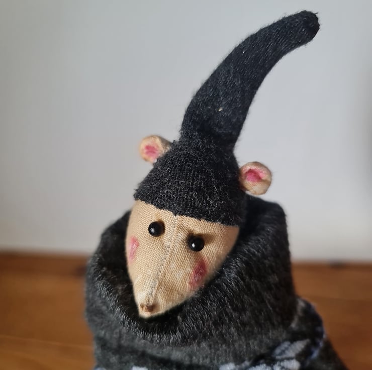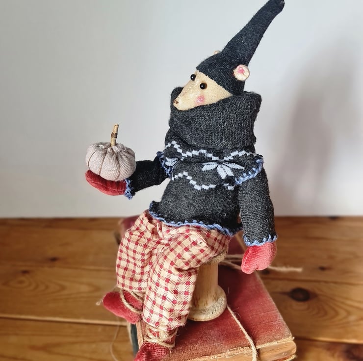 This one of a kind piece is made from unbleached cotton. And is hand and machine stitched, as well as hand painted and stained . He is wearing a little grey jumper and matching hat, and homespun chequered trousers. He has lush wine coloured velvet gloves and boots. He is bringing the gift of a powder pink pumpkin as he sits on a cotton reel stool.