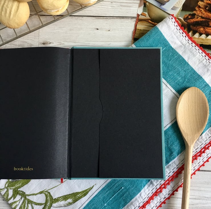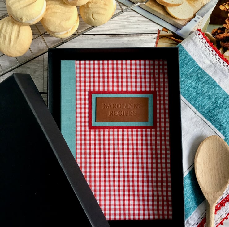 I wanted to design a recipe book that reflected the sensory experience of cooking. What says 'kitchen' and 'home baking' more than gingham? I just had to use real gingham material for the cover and chose teal book cloth for the spine to bring out that kitchen vibe. An inside pocket was essential for all those precious recipes written in grandma's own hand. Embossing the personalised label on a genuine leather panel is the final touch in the process, making every book unique to their owner.