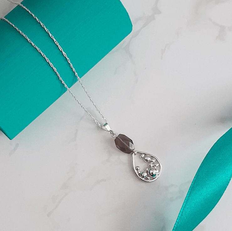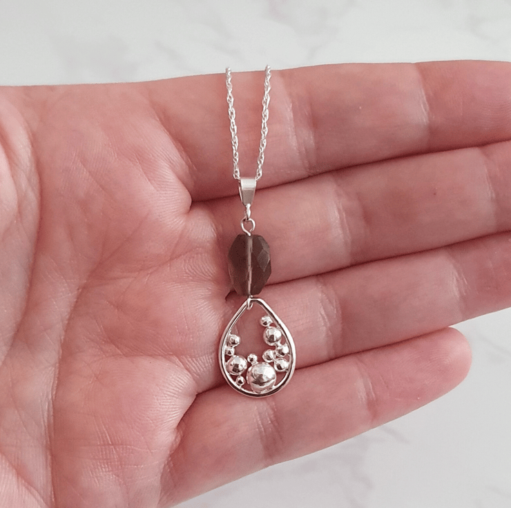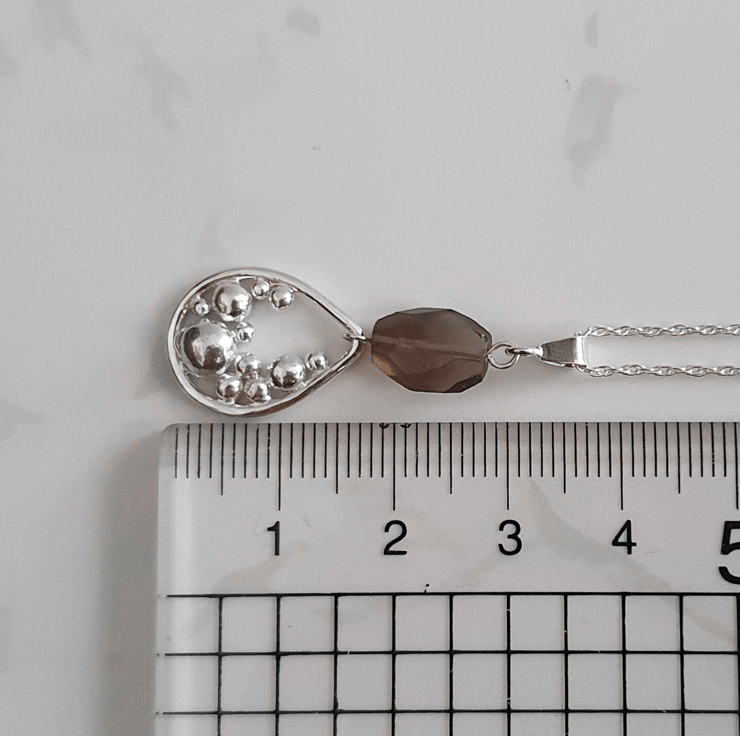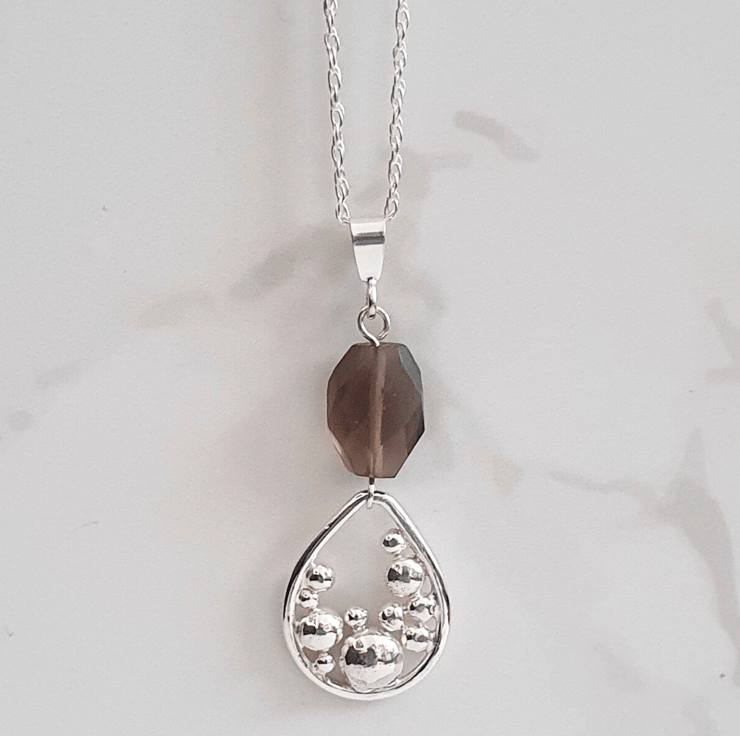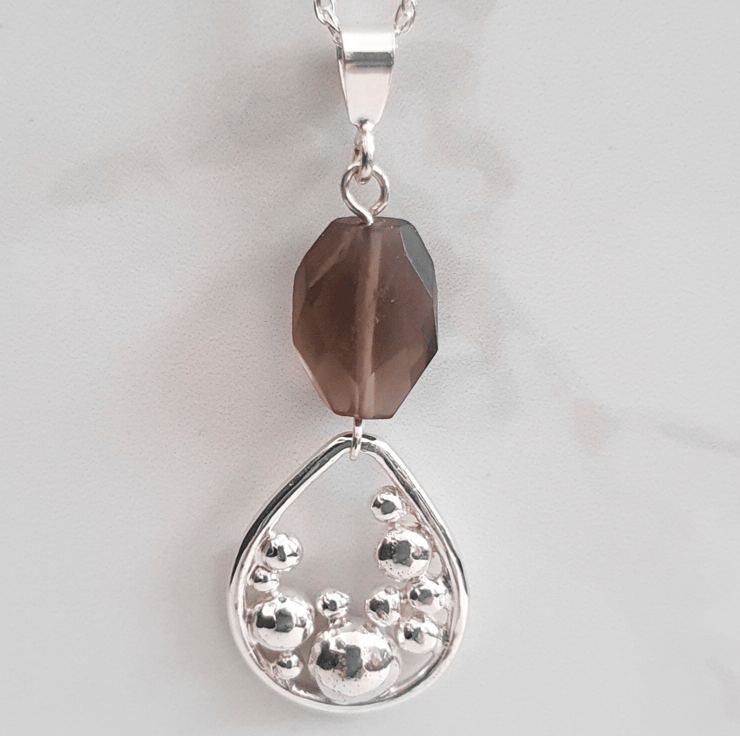 Add a unique aesthetic to your outfit with our sterling silver necklace featuring a smokey quartz gemstone and a handmade teardrop shaped 'bubbles' charm.