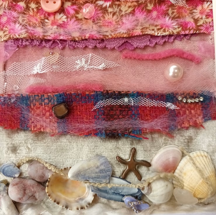 This piece is made in a blend of remnant fabrics, including some vintage floral fabric left over from a dress alteration. Beads add some sparkle to the sea with shells foraged from the beach. There's a flipflop and a starfish charm too.
