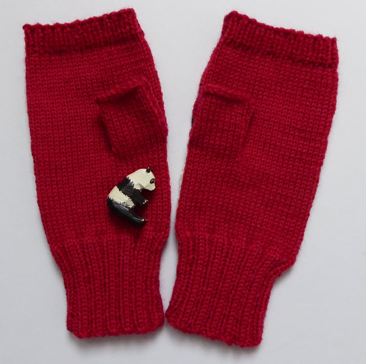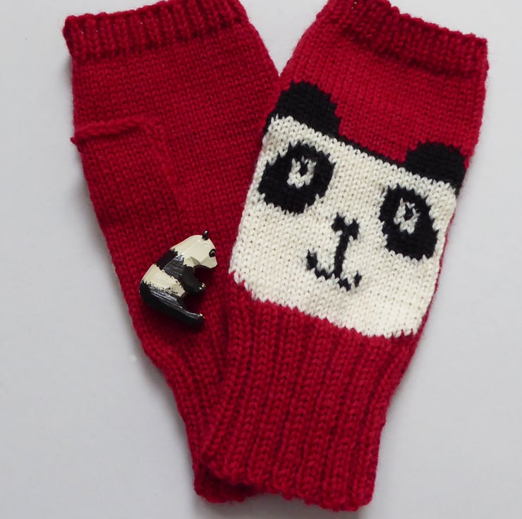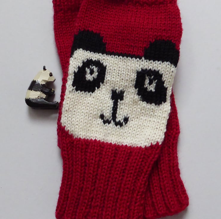 These fingerless gloves have been knitted in 4ply merino wool on my vintage knitting machine. Using the Intarsia knit method they have a cute panda face. They have no wool floats on the inside, so they are cosy and comfy to wear. An ideal gift for someone who works in a chilly studio or office. They will keep your hands warm but fingers free for tasks.