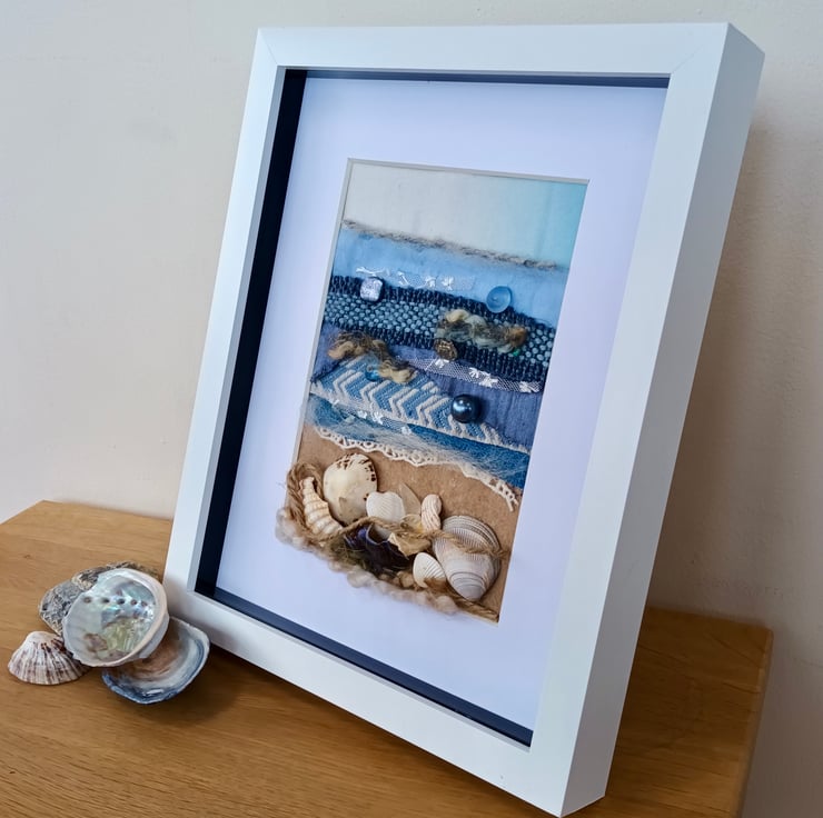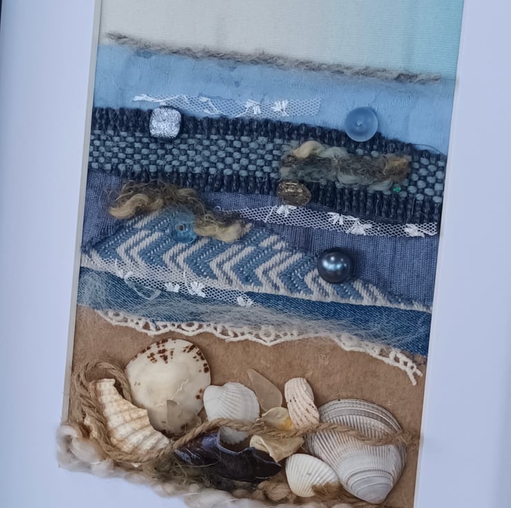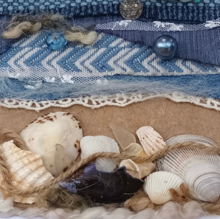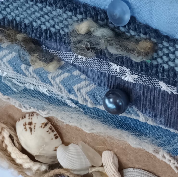 This piece uses some glass shards found in the garden, foraged shells and remnant fabrics. The beads, glass and some of the fabrics catch the light to represent the sun sparking on the sea.