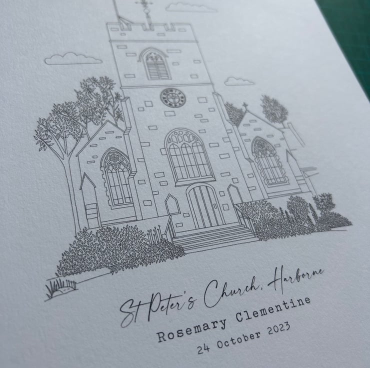 This is a bespoke illustration of the Christening venue which can be fully personalised with the child's names, name of the Christening venue and date of the Christening.