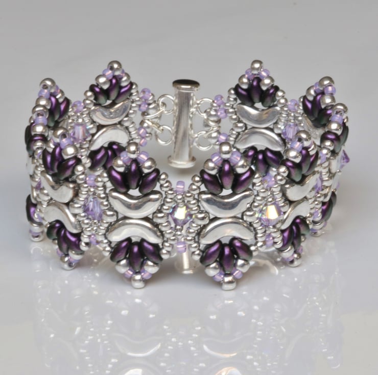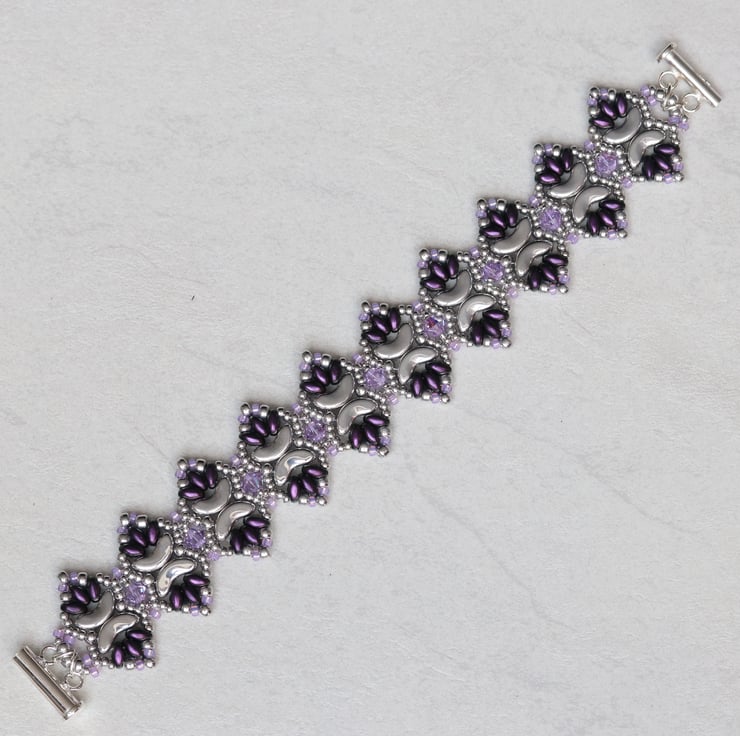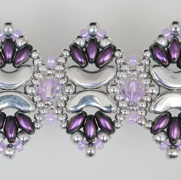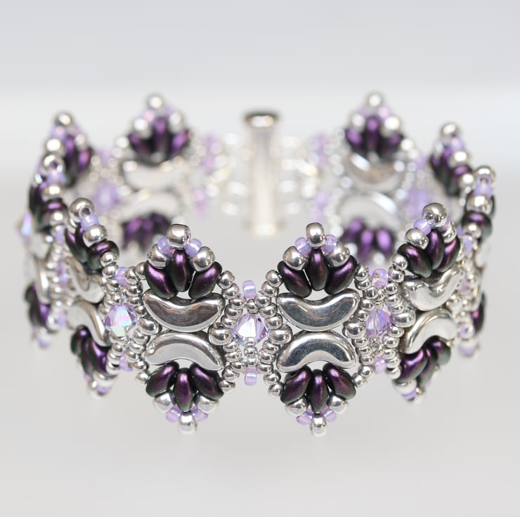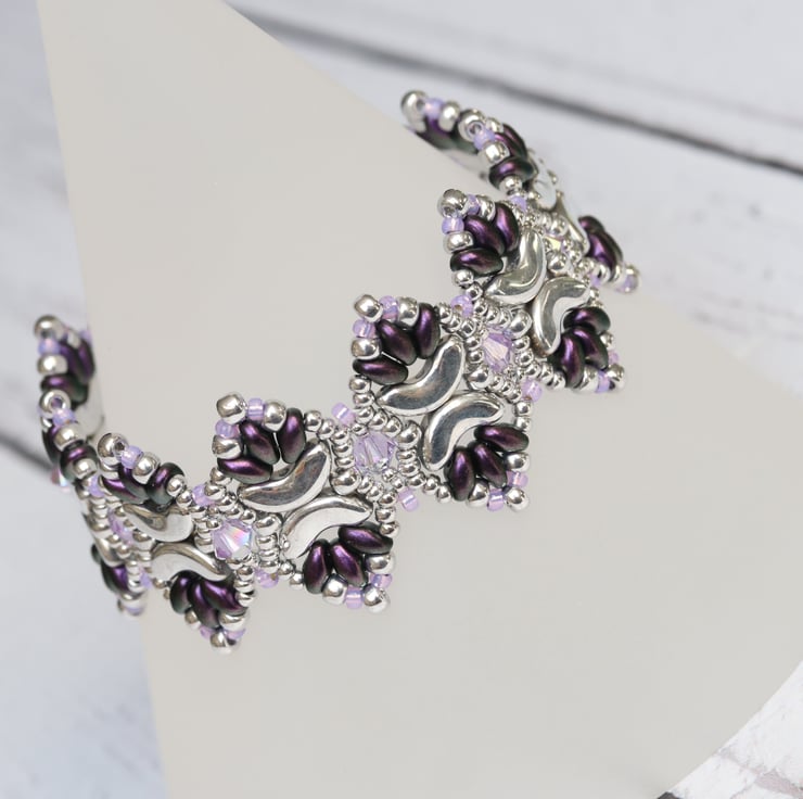 This pretty cuff bracelet has an unusual pointy profile and would go well with both formal and casual wear, thus making a useful present for someone you care about. It is made from pretty crescent shaped silver coloured Czech beads, deep purple coloured little oval superduo beads, also from a Czech company, light purple and silver seed beads and embellished with violet Swarovski crystals. It is finished with a sterling silver slide clasp.