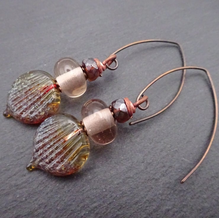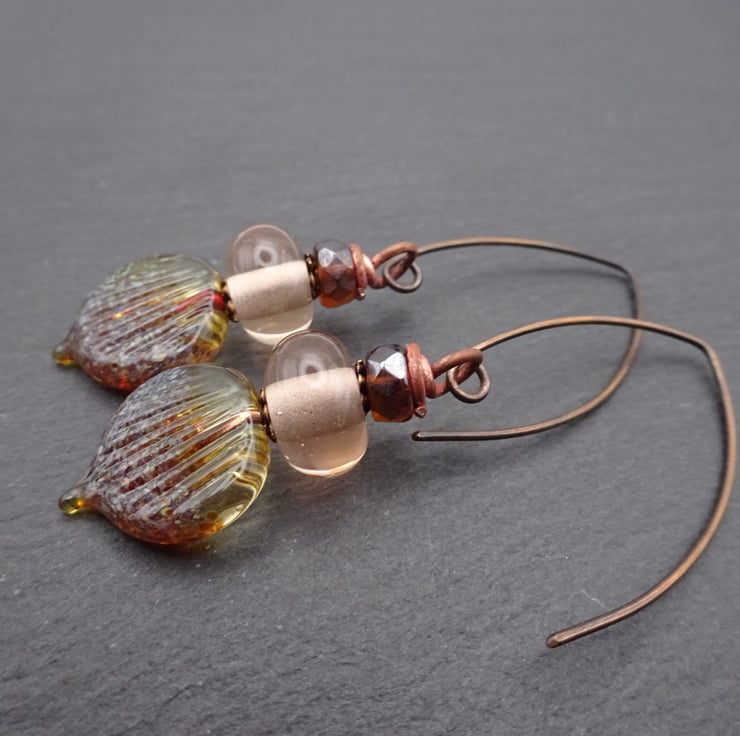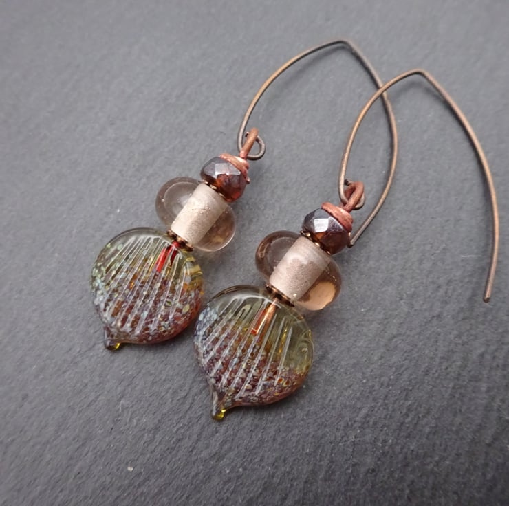 A pair of earrings made with handmade copper ear wires, Czech glass beads, handmade lampwork glass beads and handmade lampwork glass leaves.