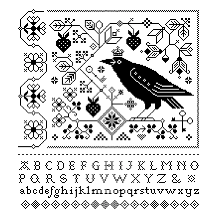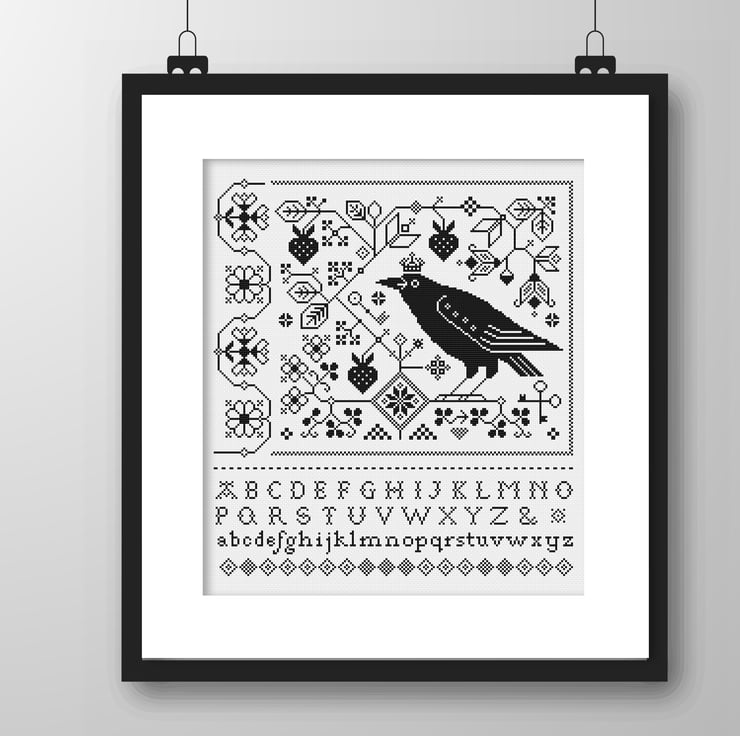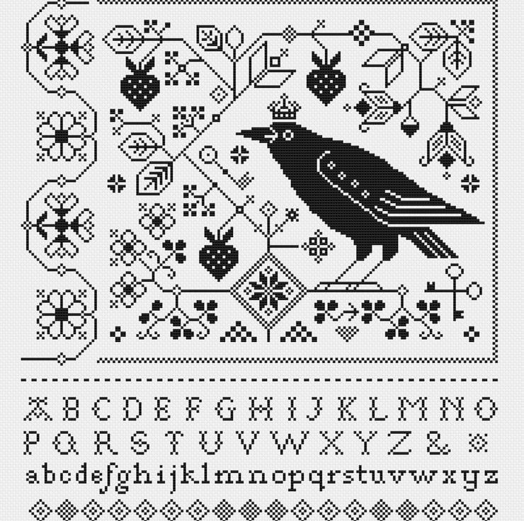 Cross Stitch Fraktur Raven, Crow, Blackbird Alphabet Sampler - Monochrome Quaker Blackwork - Modern Folk Art design - PDF counted chart 196