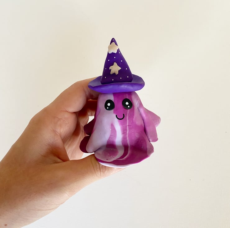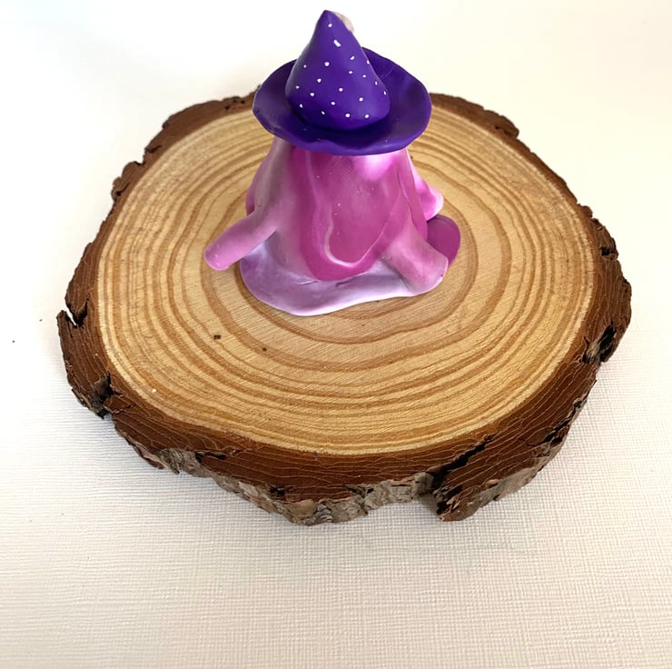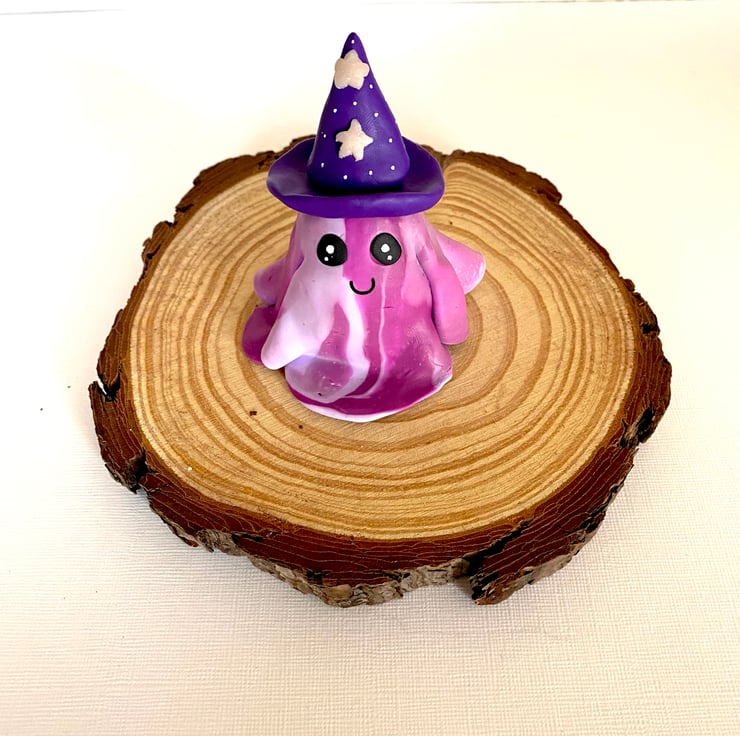 Purple ghost lovingly handmade from polymer clay, perfect for Halloween, free postage. Wood circle not included