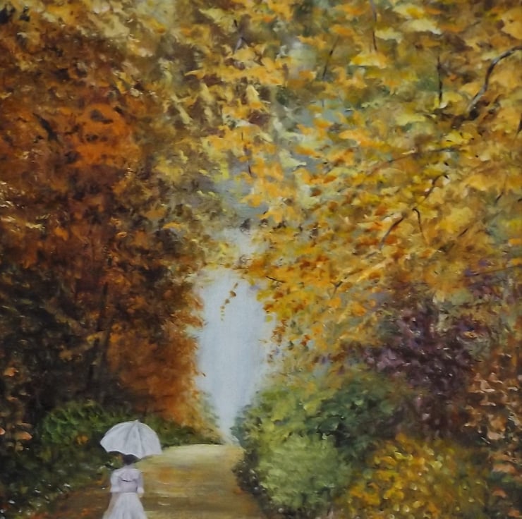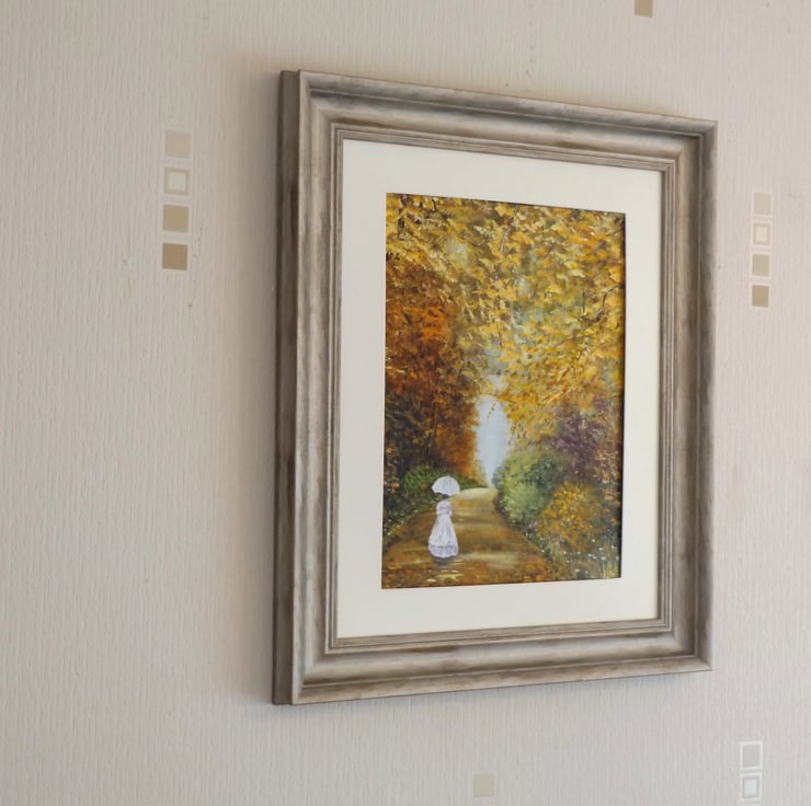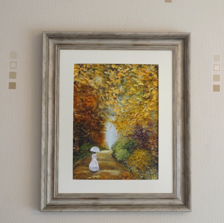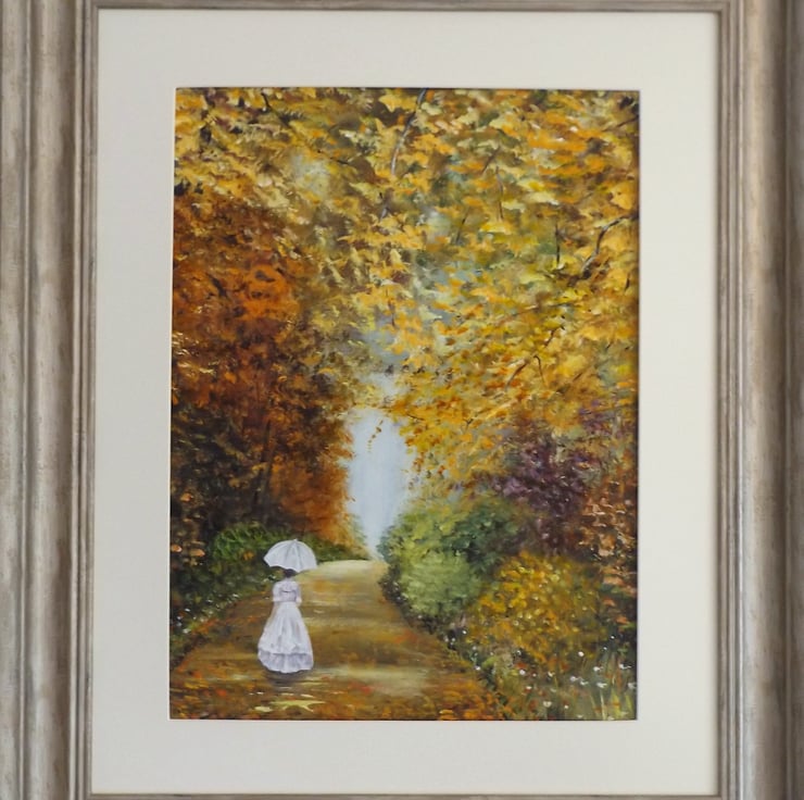 One of the many treelined walks on the Temple Newsam estate in Leeds Yorkshire, some people say they have seen a ghostly figure of a Victorian lady , ,painted in acrylic on a canvas panel. framed and ready to hang.size including frame is 20in x 24in