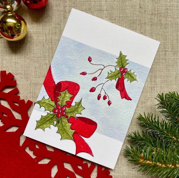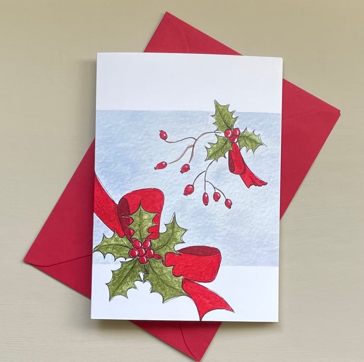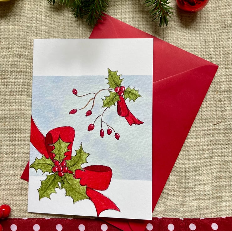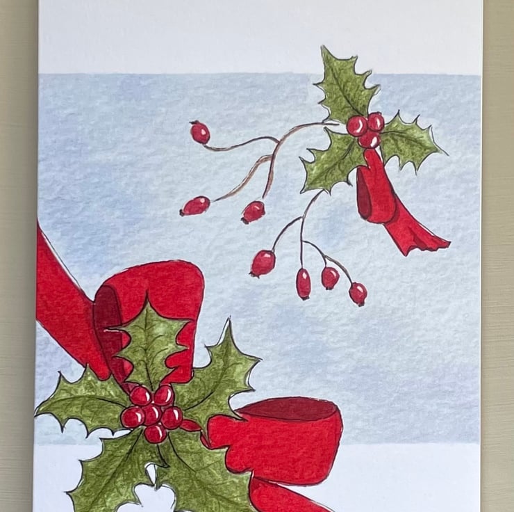 Merry Christmas, this lovely Christmas card is a print from one of my original paintings of Holly sprigs and rosehips and a big red ribbon on a frosty pale blue background.