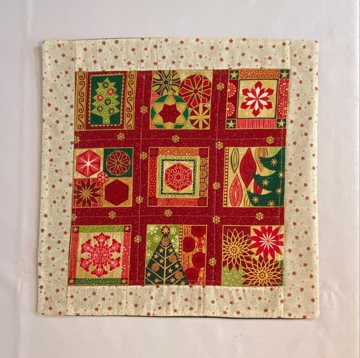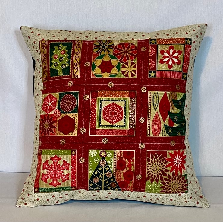 Featuring a beautiful padded centre panel of Christmas images in red, green and gold bordered with complimentary fabric of cream with red and gold. Highlighted with gold stitching. The back is in plain green and has an envelope opening for easy insertion and removal of the cushion pad (not supplied).