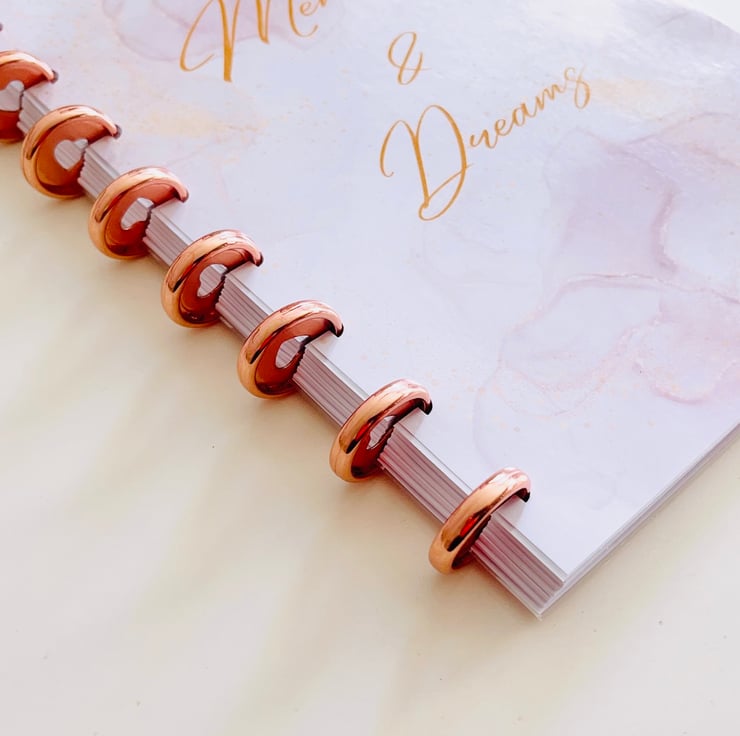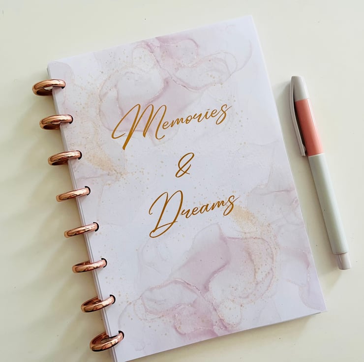 This lovely notebook with a marble design in various colours with gold accents, memories and dreams in the middle