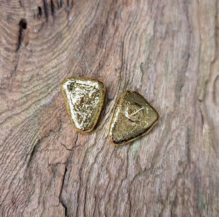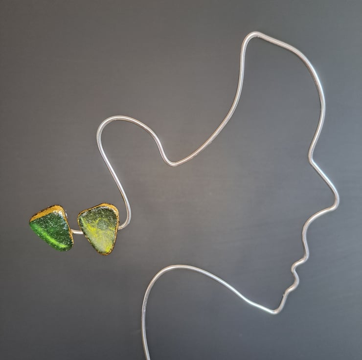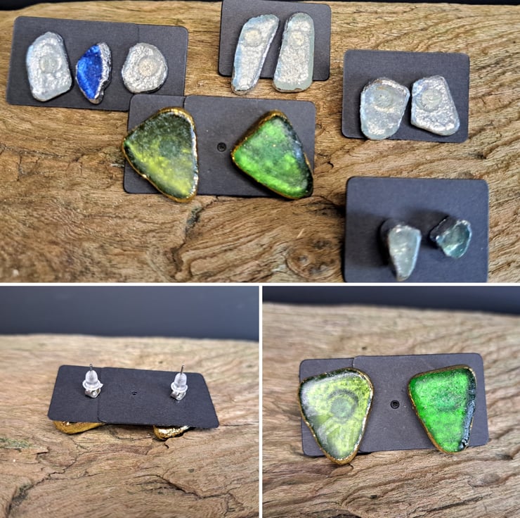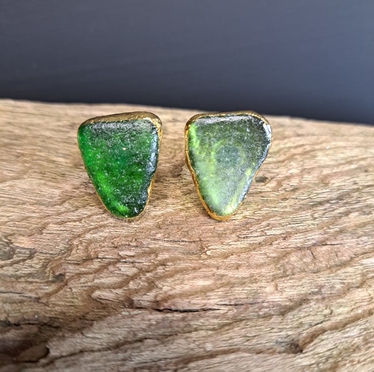 A unique pair of Emerald green sea glass stud earrings with gold leaf detail. The sea glass was lovingly sourced from the Kent coast. This has been attached to stud earring posts and gold leaf has been added to give that extra sparkle. These have been coated to protect and enhance their shine. Two backs are provided for you to choose from, these are a butterfly back and a plastic back.