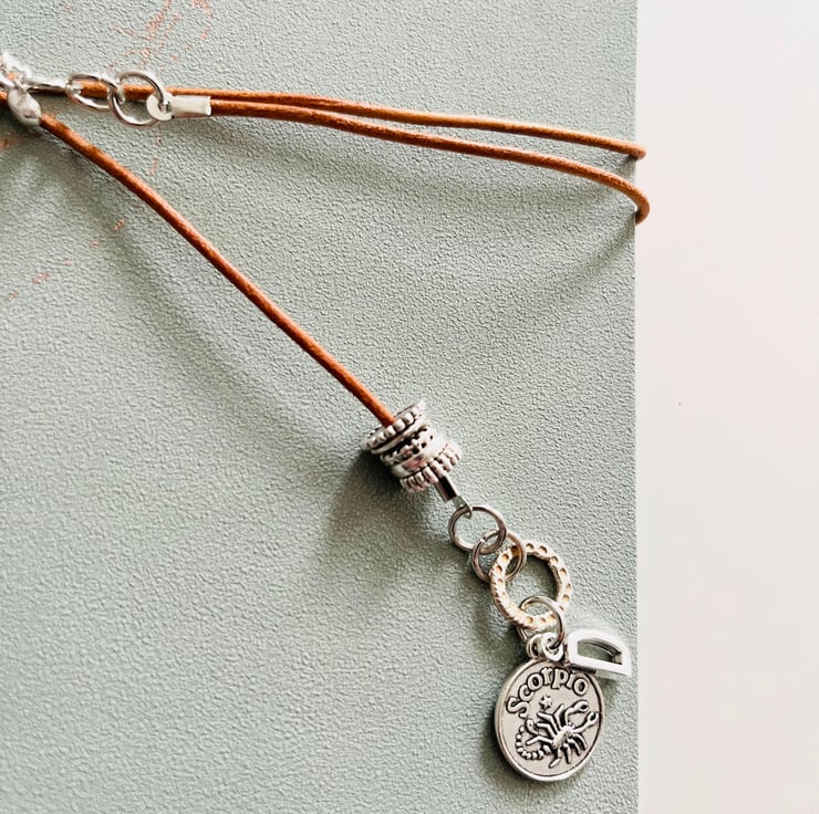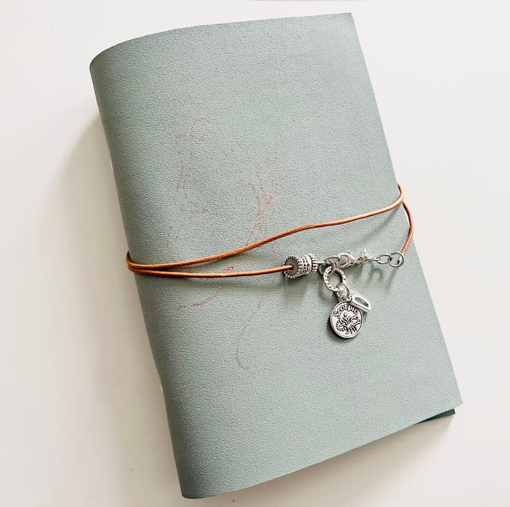 The planner has a wraparound closure made of leather cord in tan to coordinate with the mint green with silvertone beads, zodiac and initial charms