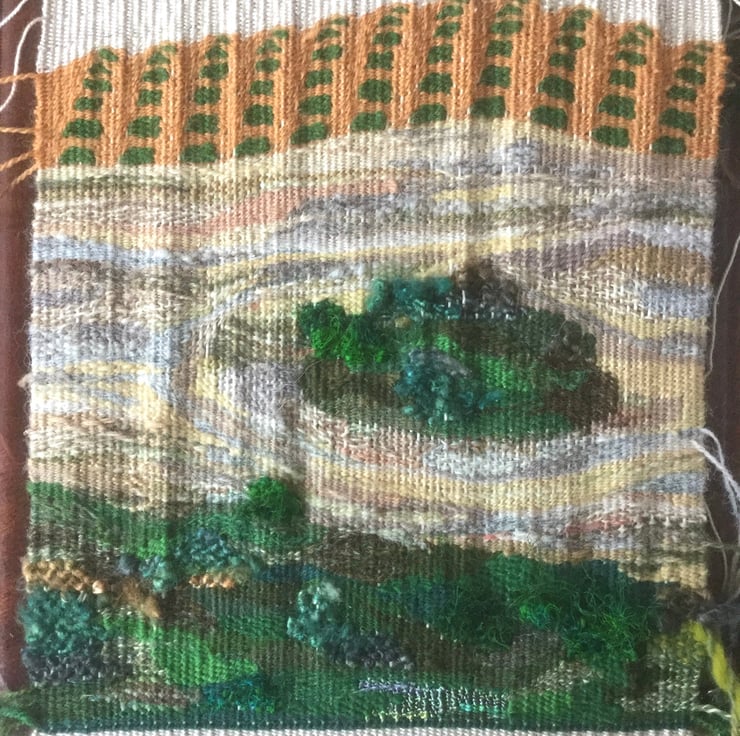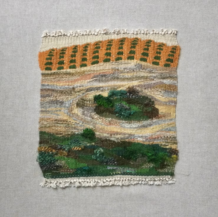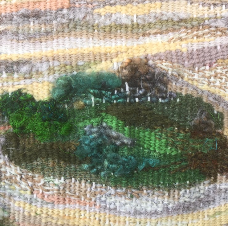 The True Cost of Palm Oil is a one of a kind tapestry weaving which has been hand woven with a mixture of wools, sari silk yarn, banana silk and rayon yarn, in various shades of green, yellow ochre, grey, brown, cream, beige and orange. It is stitched onto a piece of linen mix fabric and framed in a simple lime-washed wood frame with no glass, which measures 49.5 x 50cm.