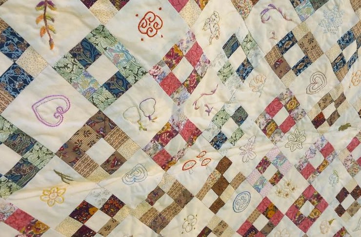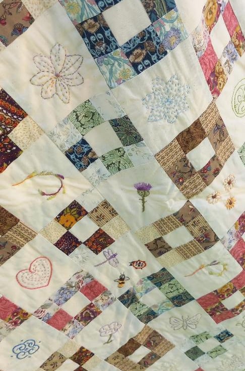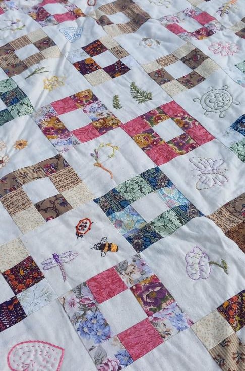 Medium patchwork quilt made using a striking traditional pattern - simple yet effective. Earthy colour tones with intricate embroidery sewing of nature designs such as flowers and insects.