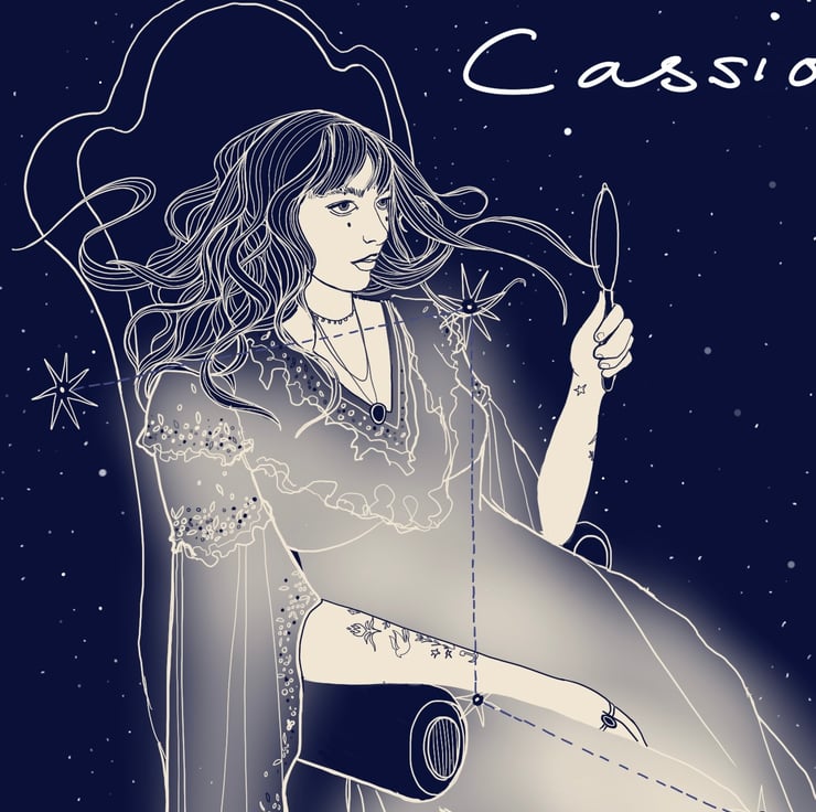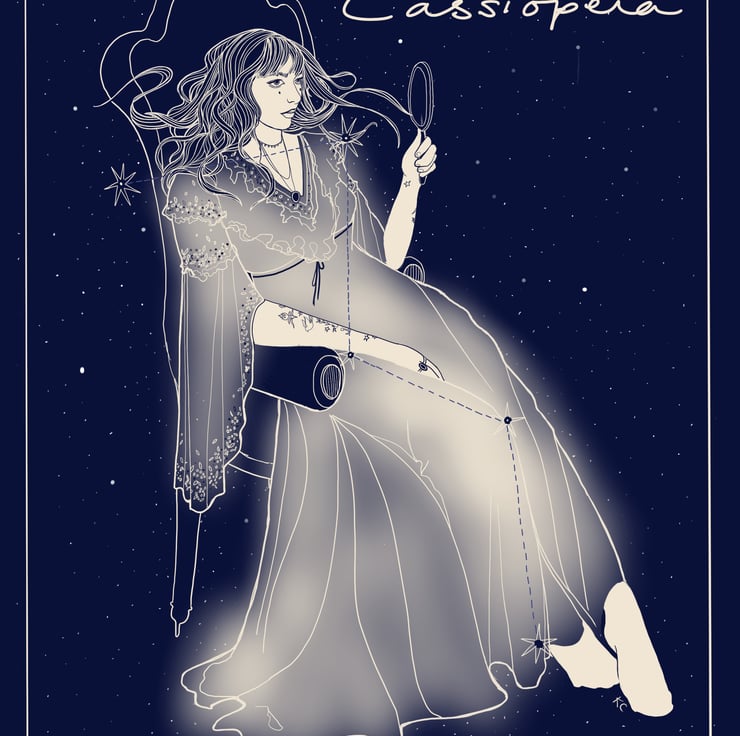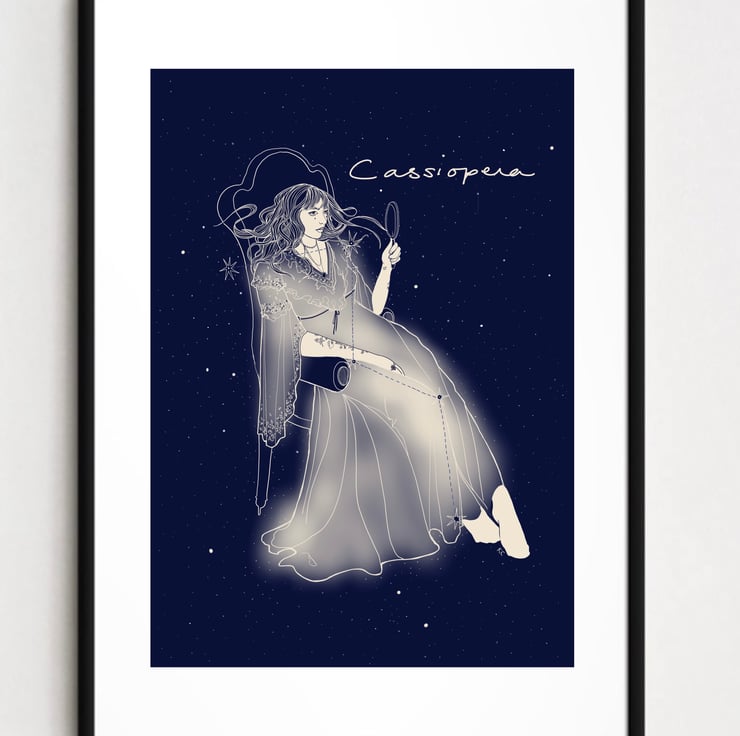 This an A4 art print of the star constellation: Cassiopeia. It depicts the female character of the vain Greek Legend in all her glory as she gazes at her reflection against the deep blue night sky. The high quality illustration is printed onto 240gsm paper using a Giclee printer to give the highest quality version of the print possible.