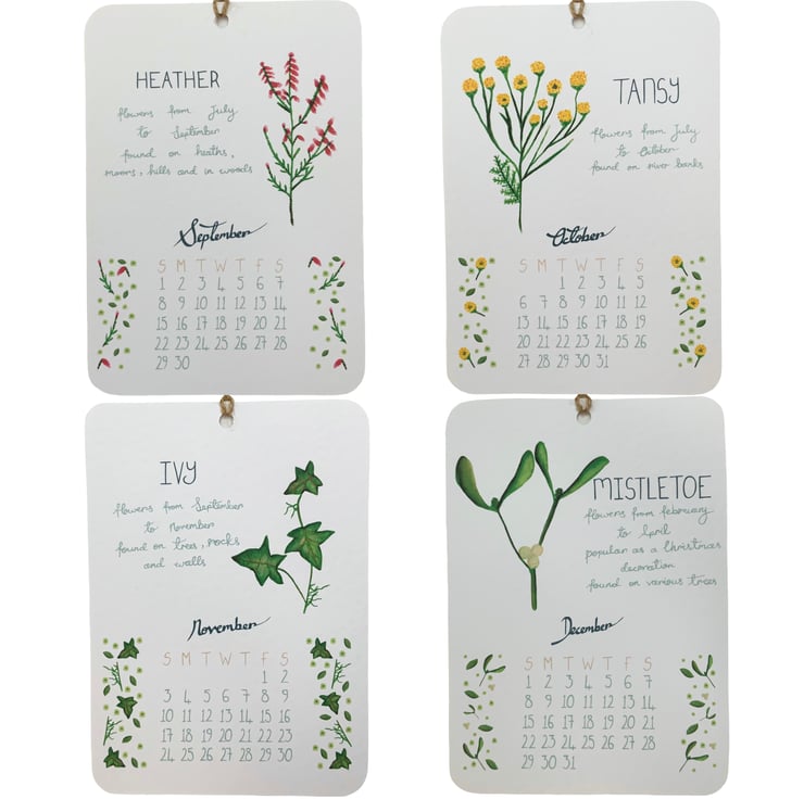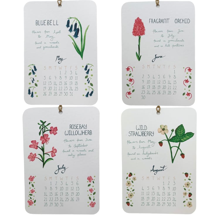 The calendar includes 12 A6 size prints, approximately 105x148mm with rounded corners and featuring my original watercolour illustrations of British wildflowers for each month, with hand lettered information for each flower and hand lettered months and dates.