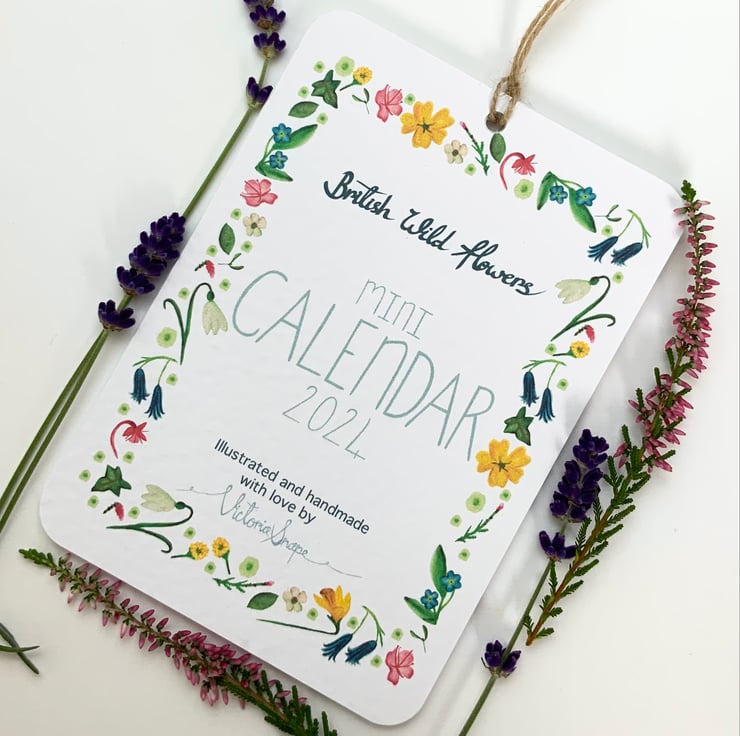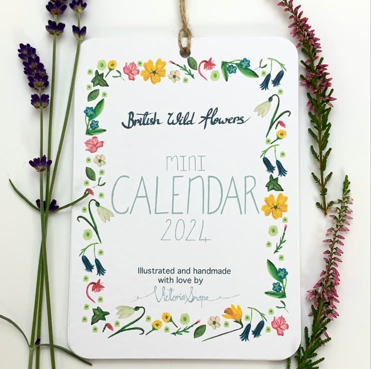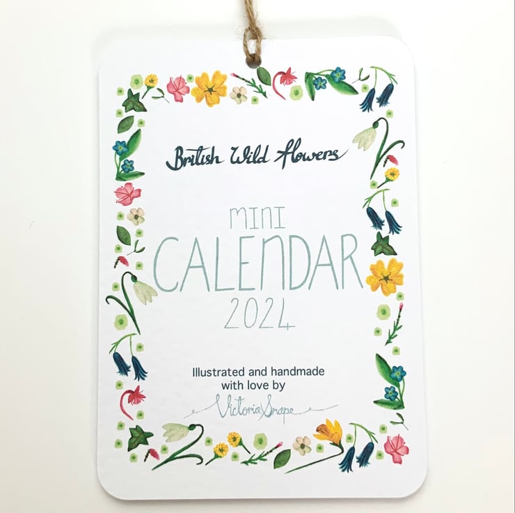 British wildflowers mini 2024 calendar with pretty watercolour illustrations and hand lettering.
