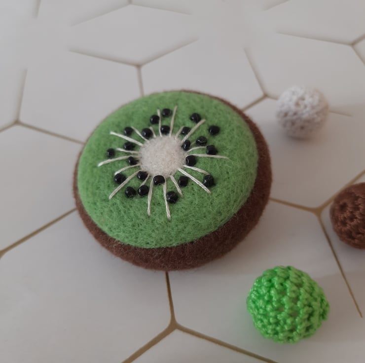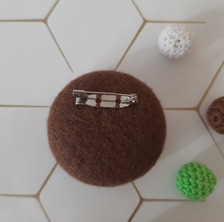 A substantial piece measuring 5 cm across, just over 1 cm thickness, needle felted to be firm enough to withstand wear for many years and travel well if sending on as a gift.