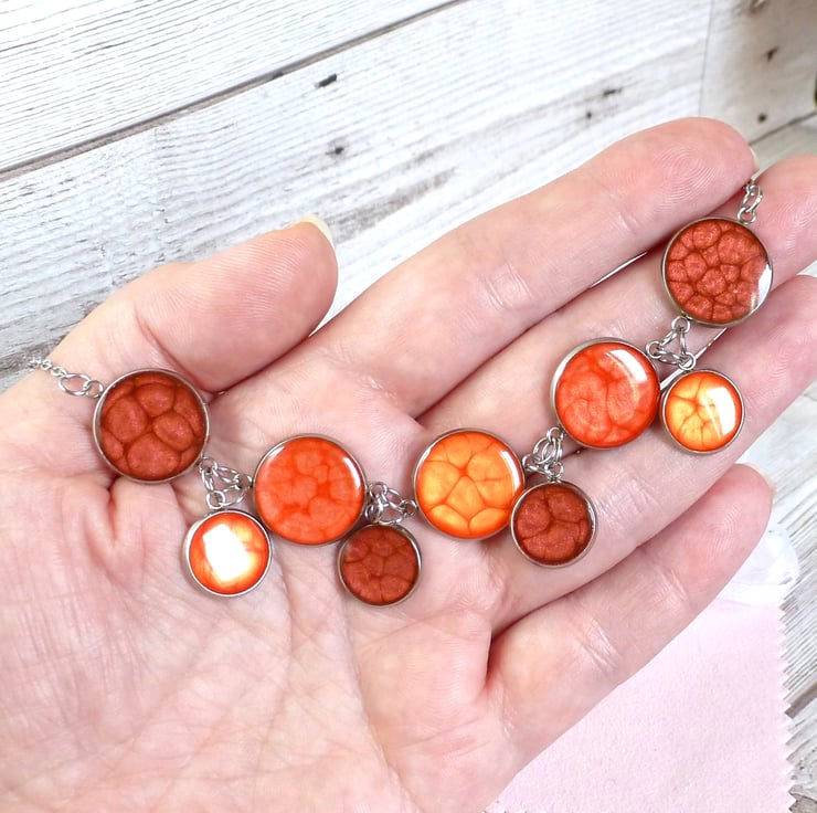 Made from hypoallergenic Stainless Steel bezels filled with bright enamels in red, bright red and orange, there's a striking necklace, colourful bracelet and matching dangle earrings.