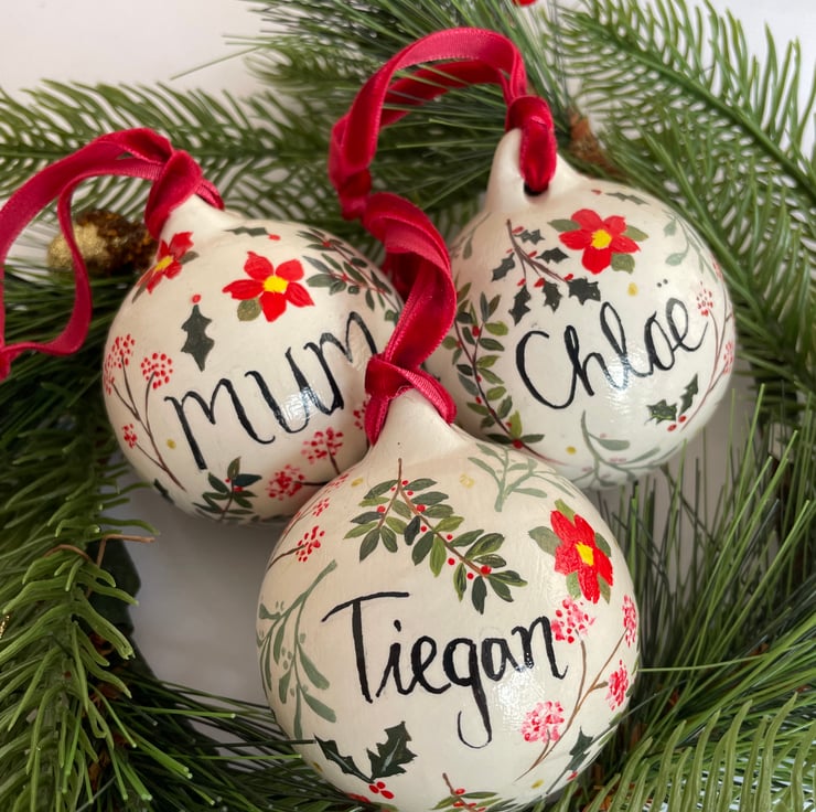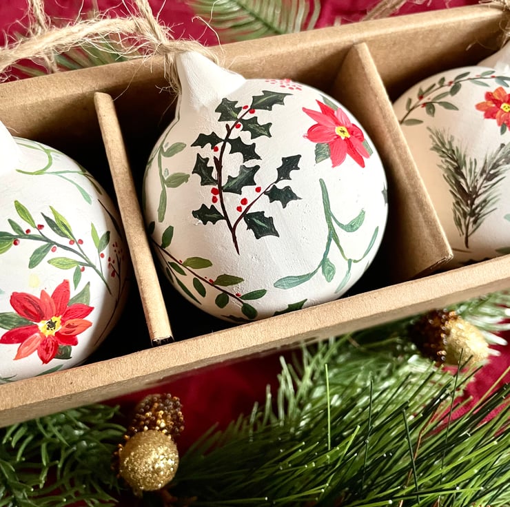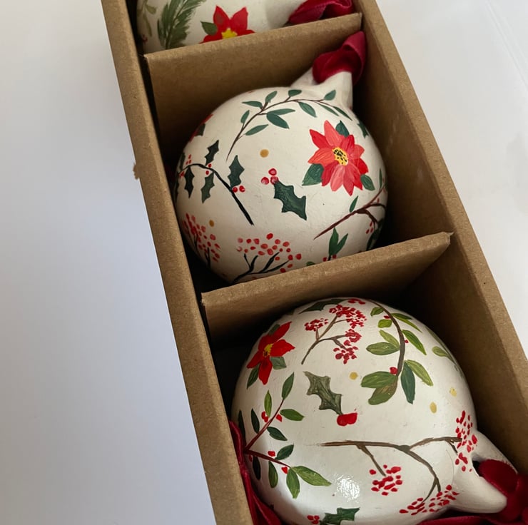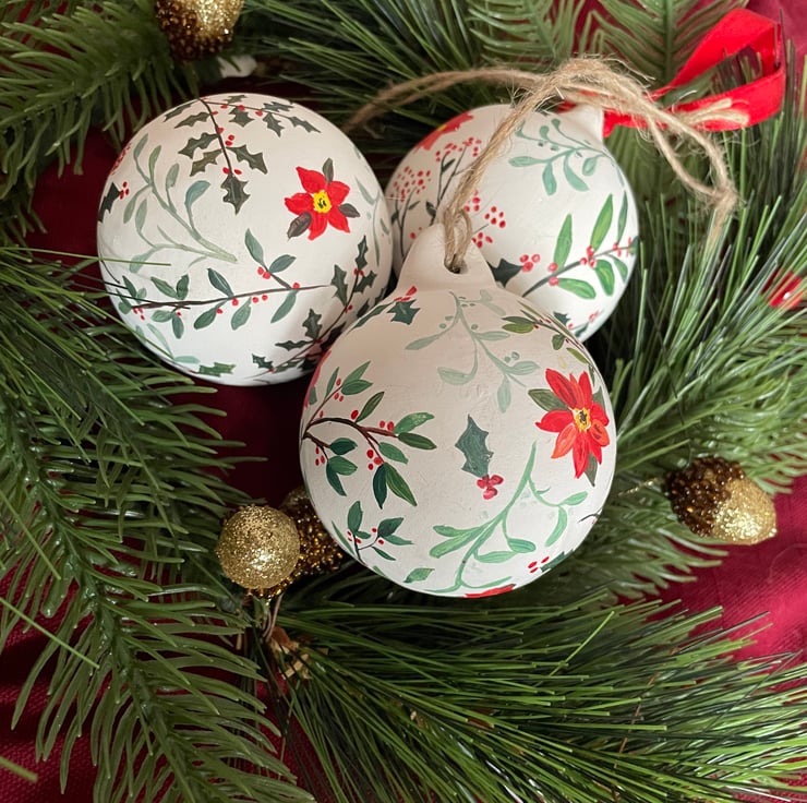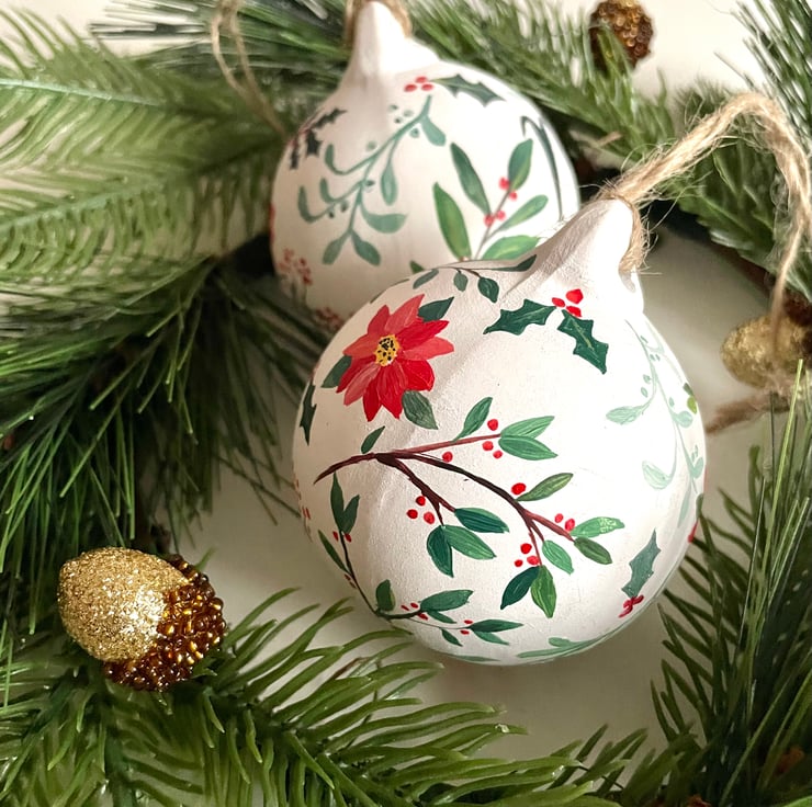 Lovingly hand painted ceramic baubles, painted with traditional green foliage pattern.
