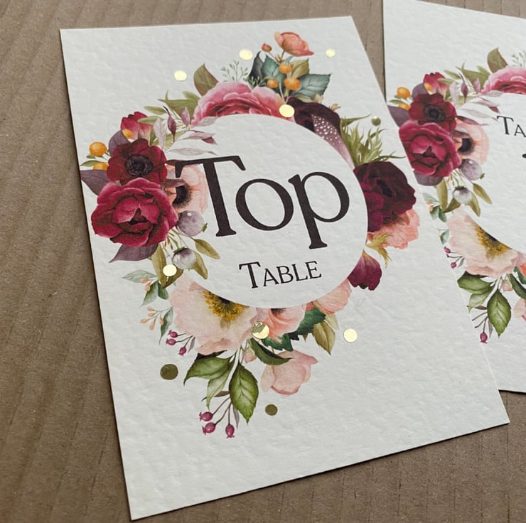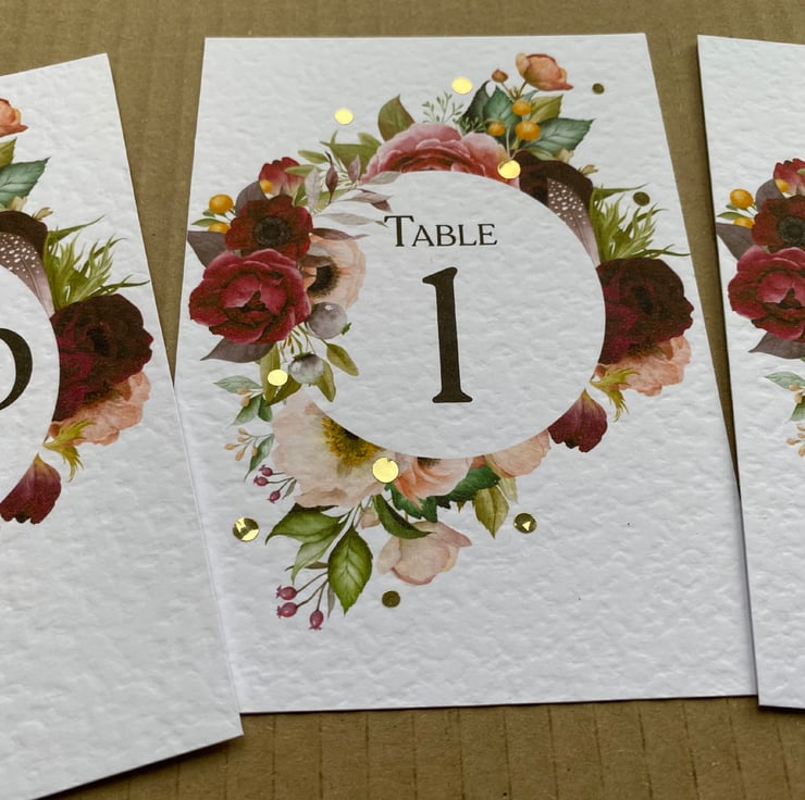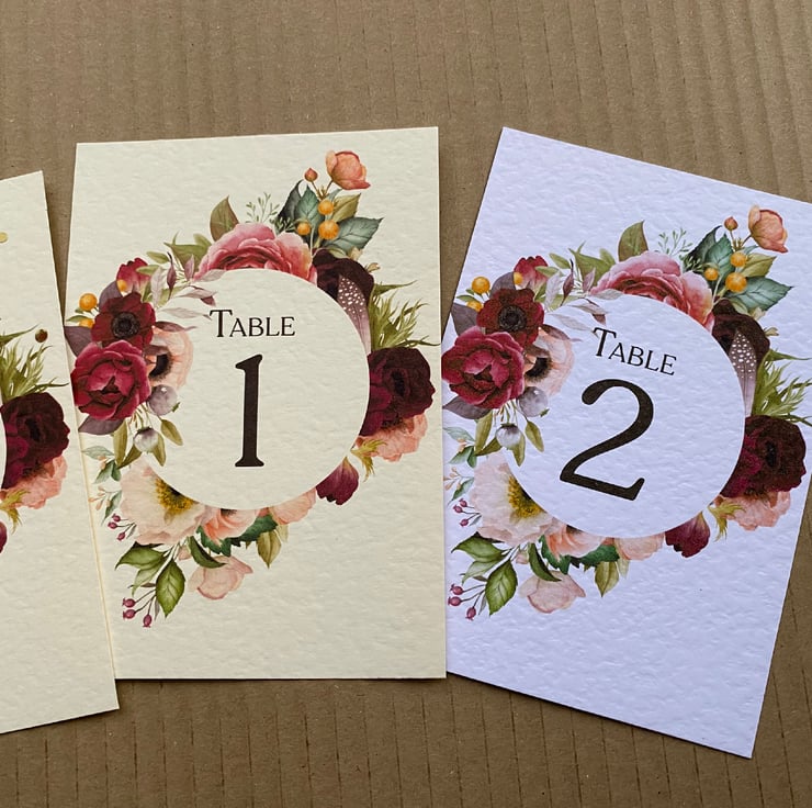 WEDDING table numbers, printed on A6 size cards. Burgundy peonies, blush pink roses, flowers and greenery, rustic wedding theme design.