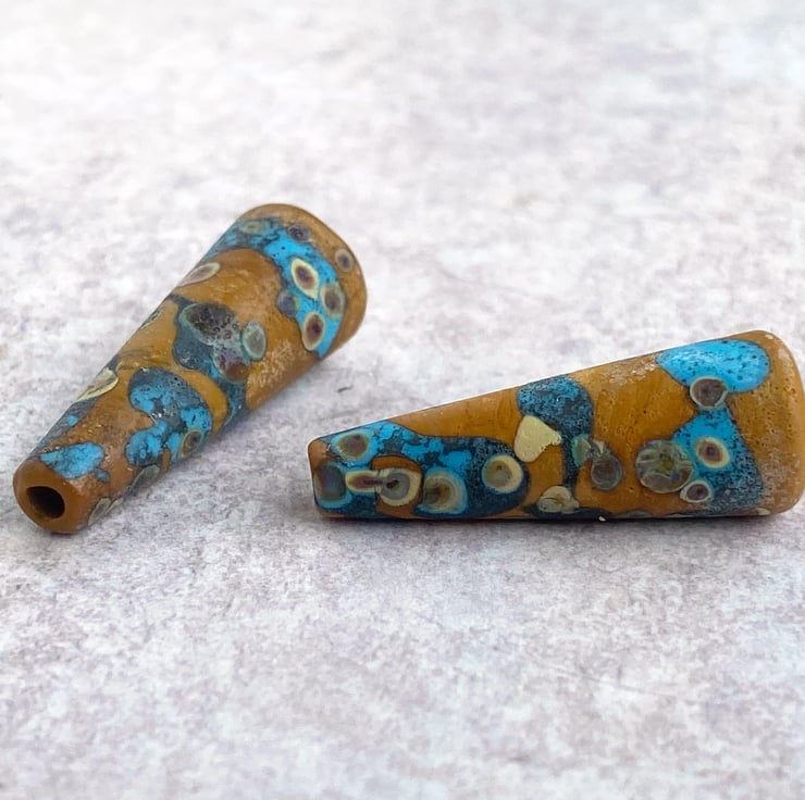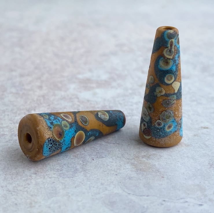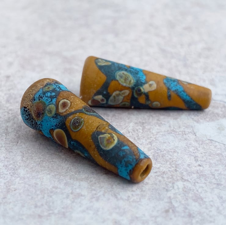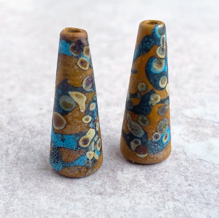 A pair of small lampwork cone beads. Opaque terracotta and dark turquoise decorated with raku frit and treated in the flame for a rustic finish.
