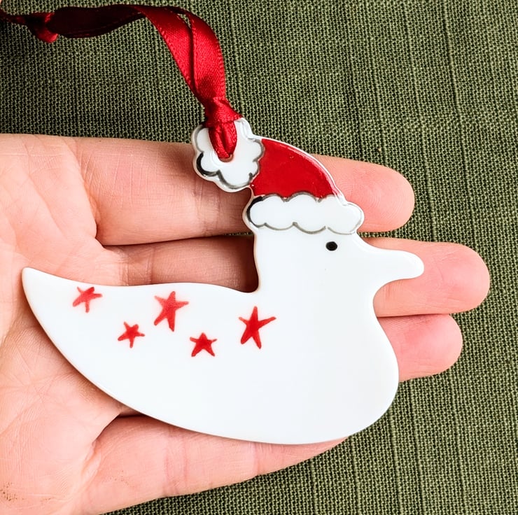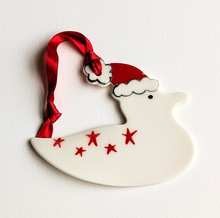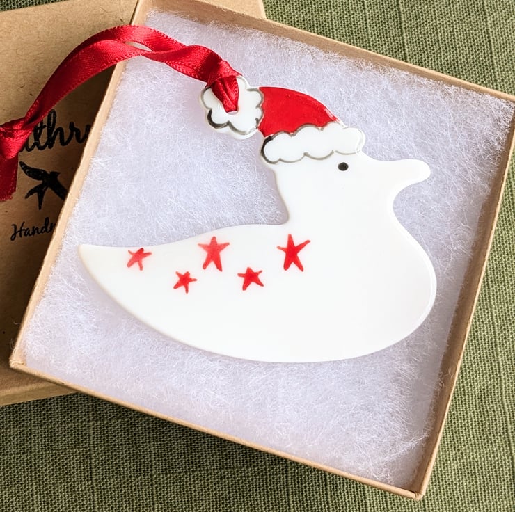 Each seagull Christmas decoration is hand-crafted in porcelain clay, decorated by hand with red stars and glaze fired to stoneware to give it a glossy finish on its front face.