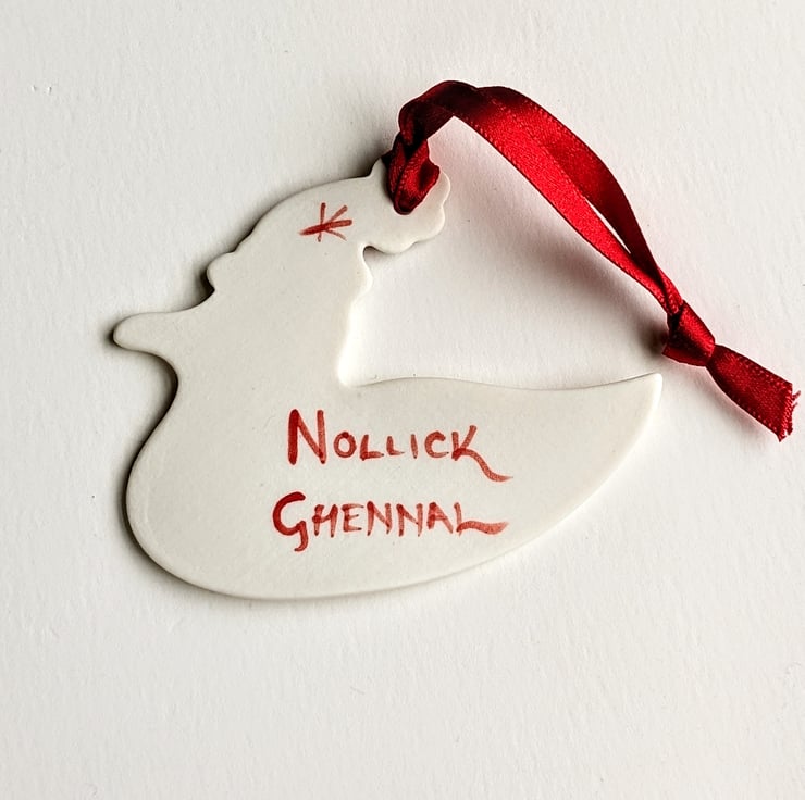 'Nollick Ghennal' which is Manx Gaelic for Merry Christmas has been handpainted on the reverse making the decoration double sided perfect for when it is hanging on a Christmas tree.