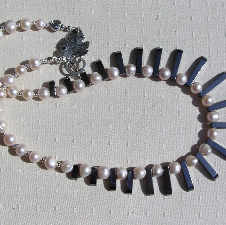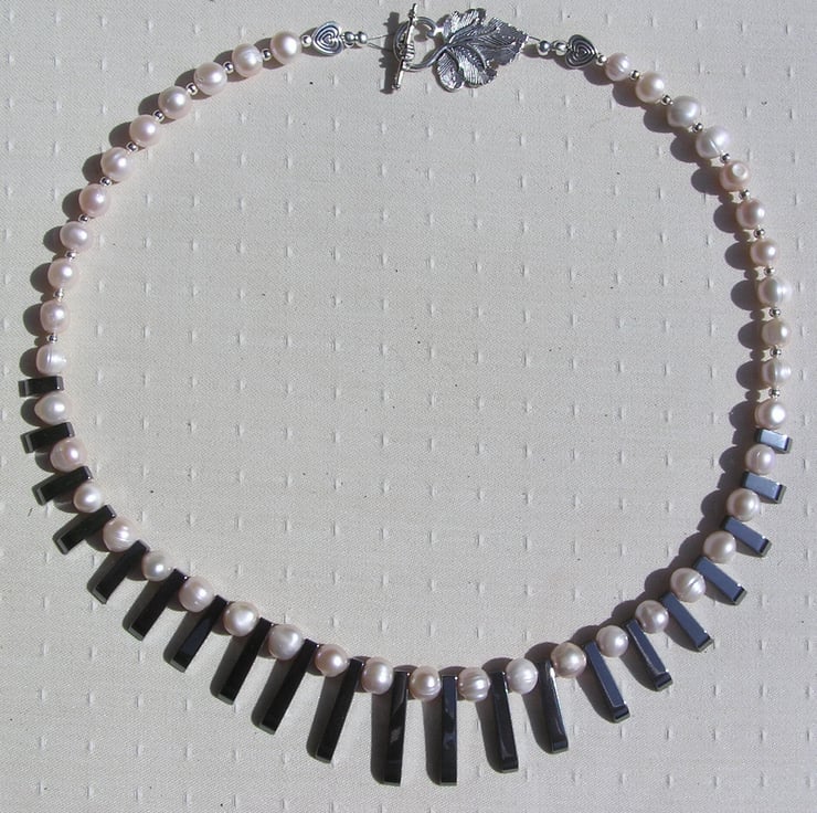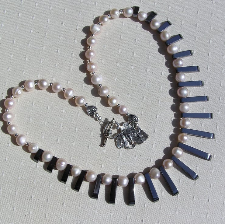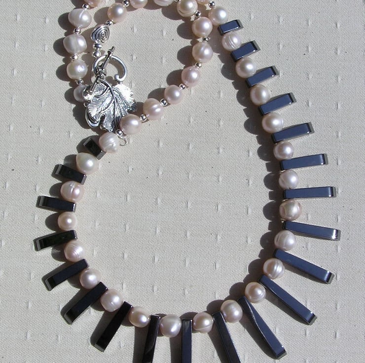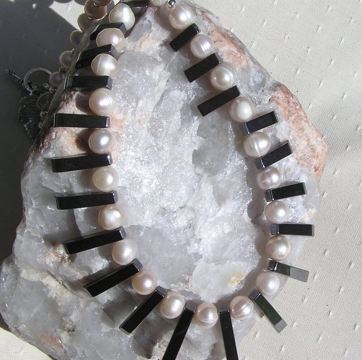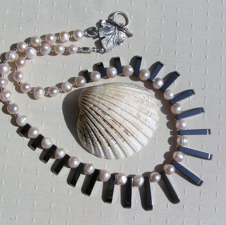 The Focal point of this Beautiful Necklace is an amazing Cleopatra style Fan made from Black Hematite of graduating lengths… Which I have then spaced with Peach Pearls – Chunky Potato. An Wonderful Gothic Swathe of Black and Purple that will look stunning either worn casually or with something more Elegant for a Special Evening out. This is one of the Most expensive Necklaces I have listed but it is exquisite and it was a pure Joy to design and make