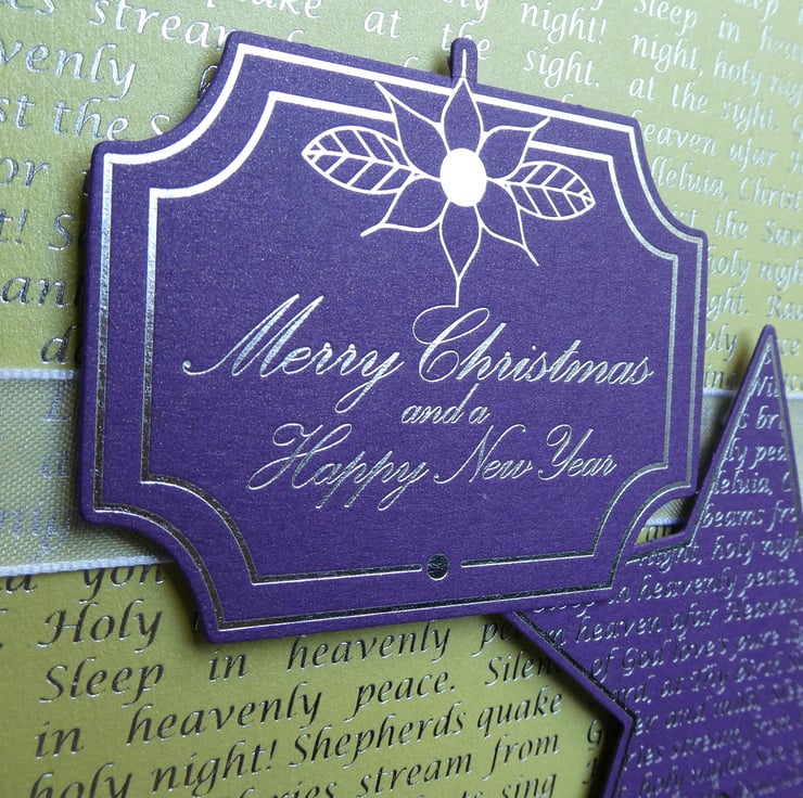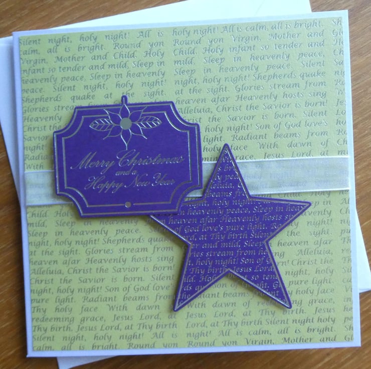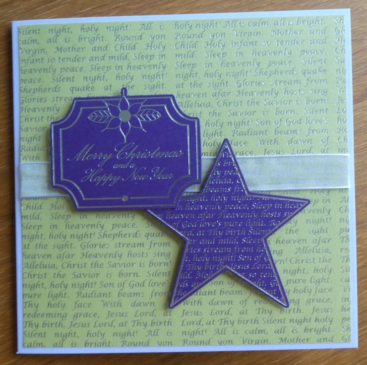 A white organza ribbon has been wrapped around the centre and a deep purple card star with silver text and a message reading Merry Christmas and a Happy New Year have been added, raised on foam pads to add dimension.