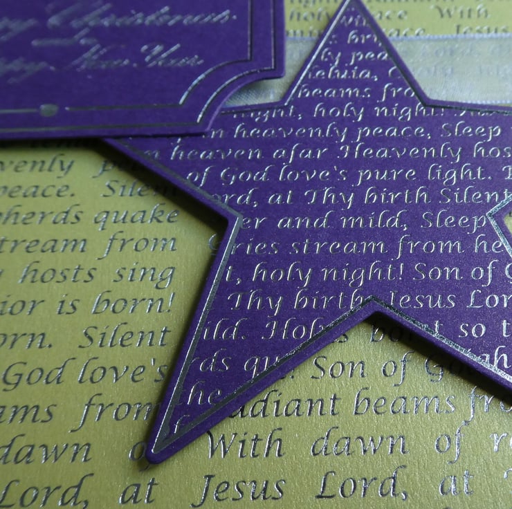 The background of lime green pearlescent paper has a silver foil printed text design, with the words from the carol Silent Night.