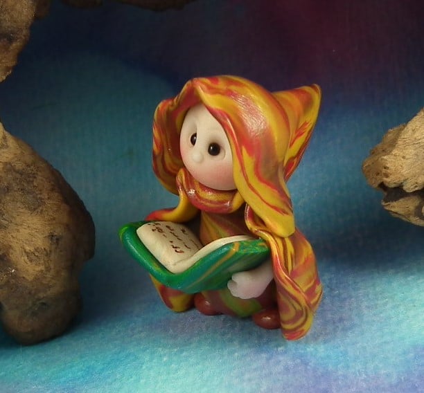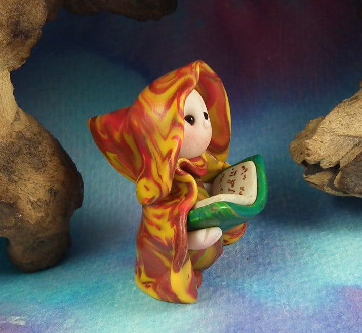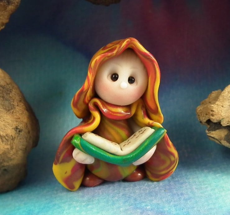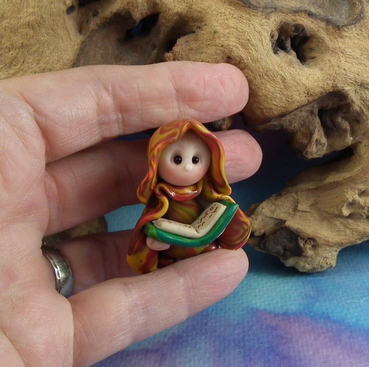 This is a 'one of a kind' creation having been entirely handmade without the use of moulds here at my studio on the Sussex Coast. Modelled with artist blend polymers, blushed before sealing with lacquer, Amos has sparkling black onyx eyes and variegated robes. Amos the Library Gnome is just one and a half inches tall.