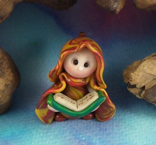 Tiny Library Gnome 'Amos' with book OOAK Sculpt by Ann Galvin