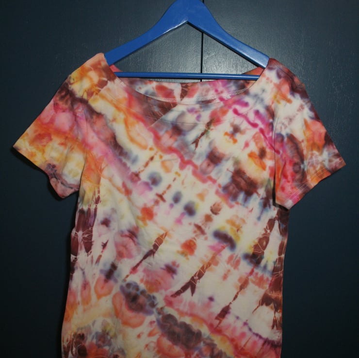 A beautifully soft Size 14 Ladies top, showing beautiful splits from red, orange and yellow powder dyes, using an Ice Dye technique. This is a second chance item, originally from Nutmeg.