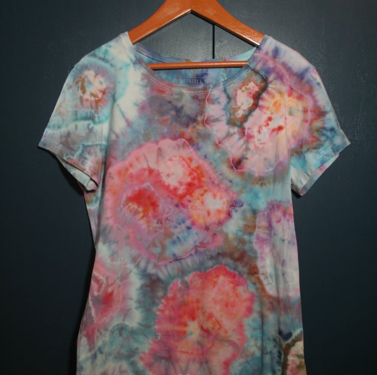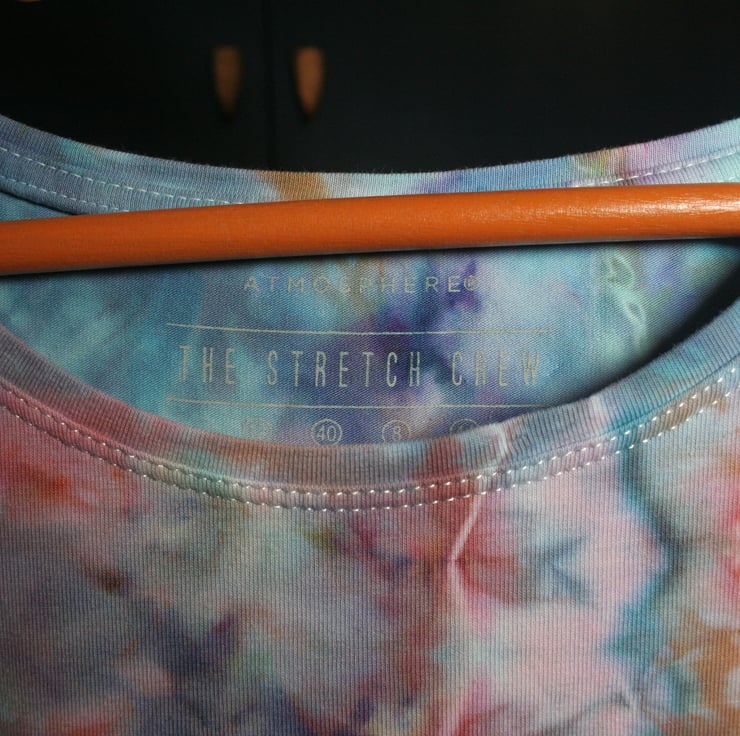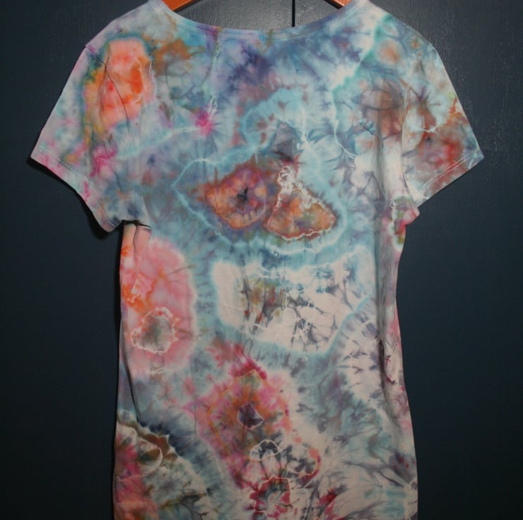 Stunning colours and patterns created using a Geode Ice Dye technique. Blue, pinks and oranges have created gorgeous colour splits. Very unique Size 12 Ladies T-shirt. This is a second chance item - original garment is "ATMOSPHERE" The Stretch Crew.