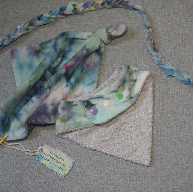 These beautifully patterned and soft Bib & Baby Comforter are made from Bamboo Jersey and Bamboo Terry Towelling. These materials are super soft, absorbant and much more eco friendly than cotton. The pattern have been hand ice-dyed, and have the added advantage of hiding dribble stains incredibly well - take it from a Mum who knows!