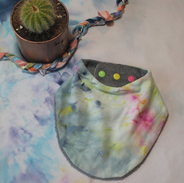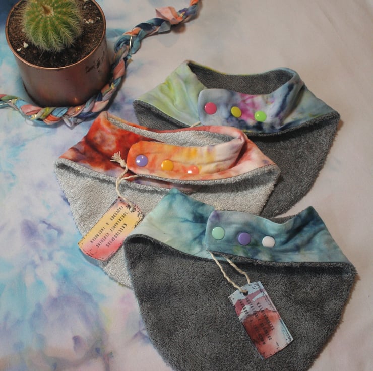 These beautifully patterned and soft Bibs are made from Bamboo Jersey and Bamboo Terry Towelling. These materials are super soft, absorbant and much more eco friendly than cotton. The pattern have been hand ice-dyed and has the added advantage of hiding dribble stains incredibly well - take it from a Mum who knows! The rounded shape allows for more coverage - perfect for teething.